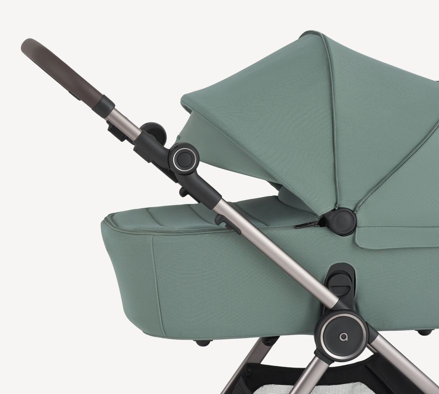 Belüftung 360°. Damit Dein Kind bequem und kühl bleibt, verfügt der IQ über ein ausgeklügeltes Atmungssystem, das an den richtigen Stellen für Belüftung sorgt – vom Verdeck des Kinderbettes über die Fußstütze bis zum Verdeck der Sitzeinheit. Auch die Rückenlehne hat eine Netzbelüftung.