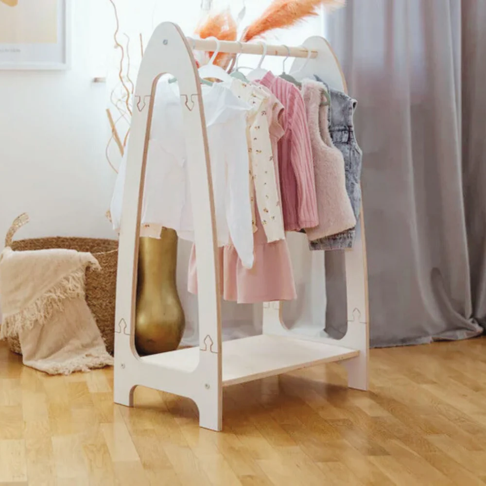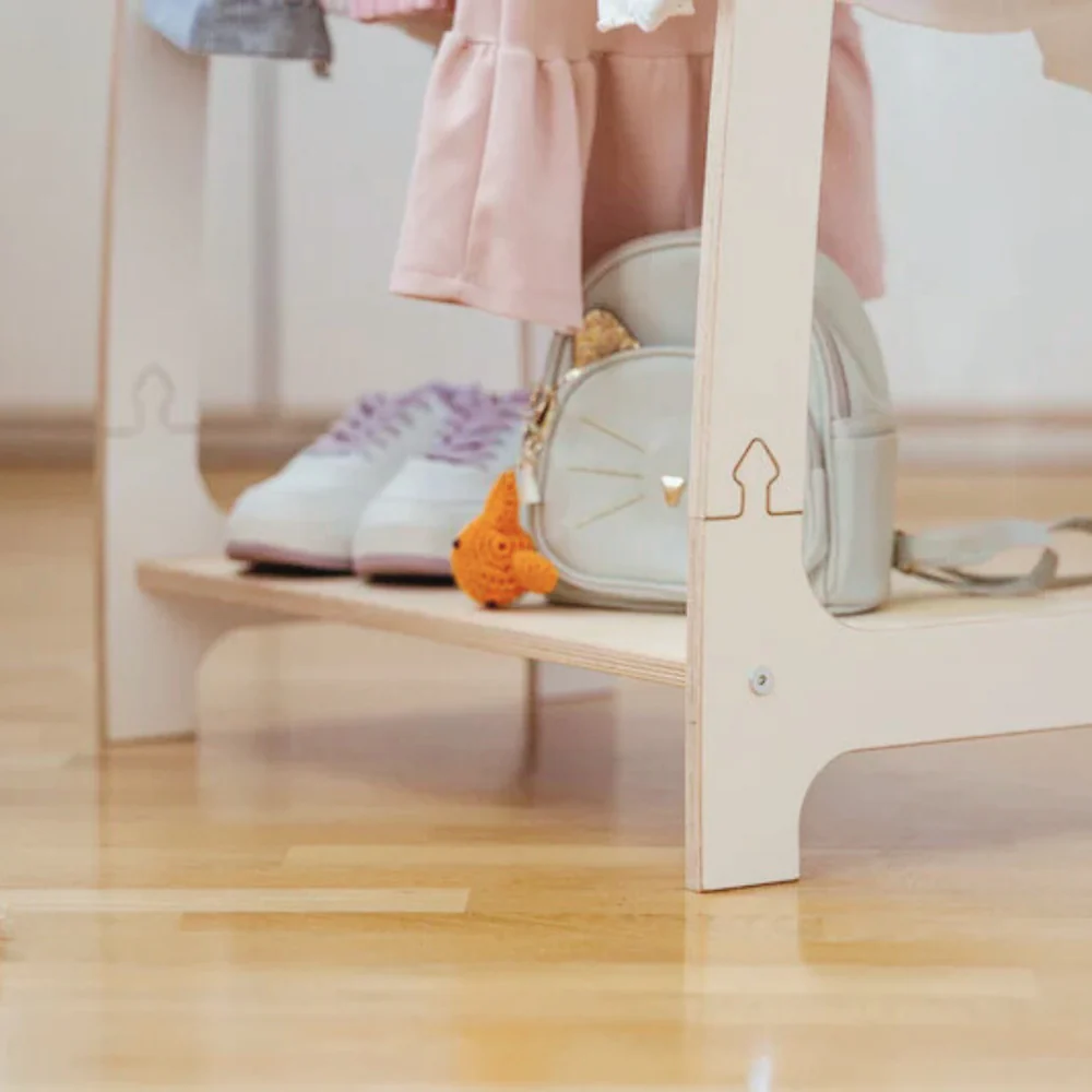 Dank seines durchdachten Designs ist der Hänger nicht nur ein praktisches Möbelstück, sondern auch ein echter Blickfang im Kinderzimmer. Die stabile Konstruktion und die kinderfreundlichen Formen machen ihn perfekt für den täglichen Gebrauch und unterstützen Kinder dabei, spielerisch Ordnung zu lernen.