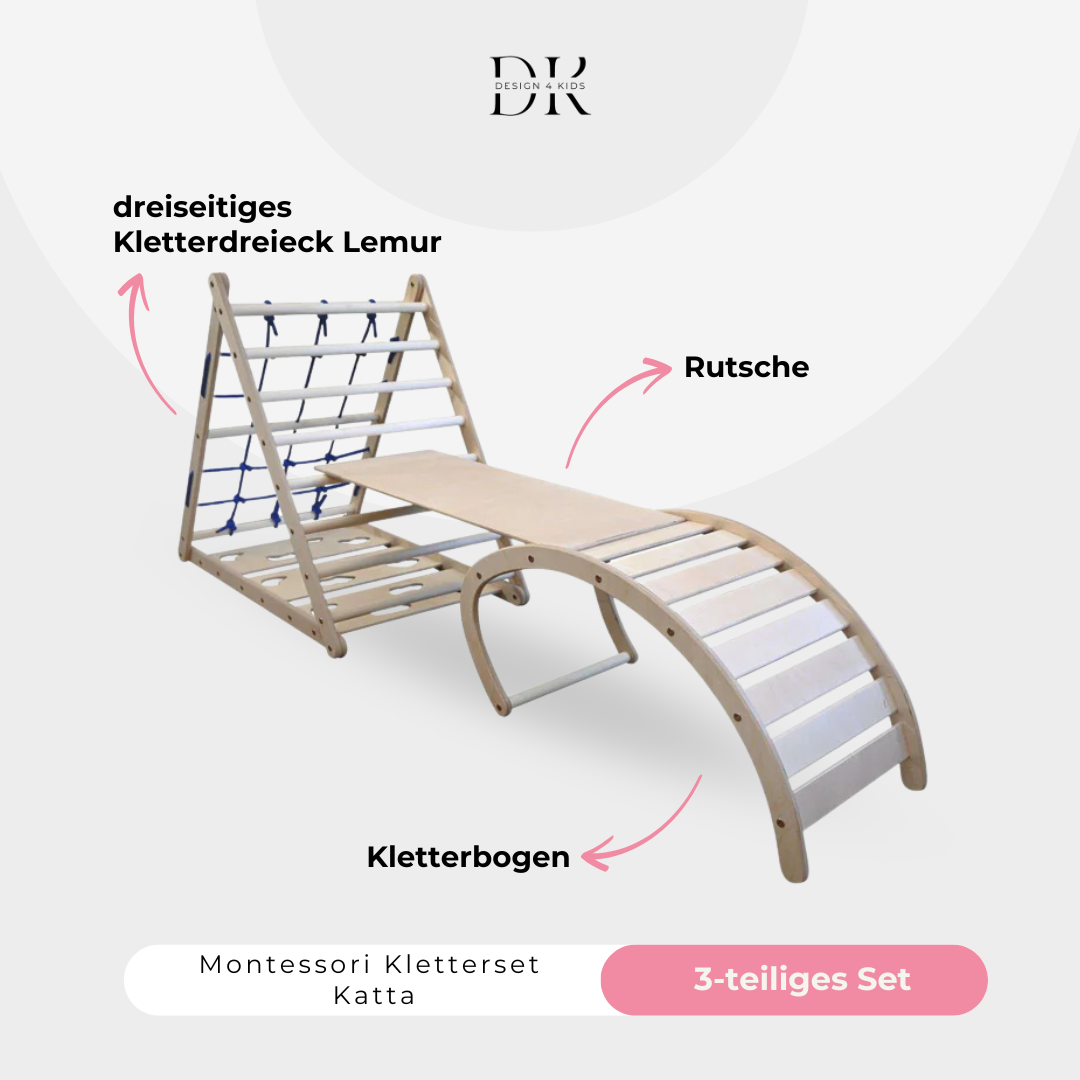 Design4Kids Kletterset Katta - dreiseitiges Kletterdreieck mit Nylonseil, Rutsche und Kletterbogen