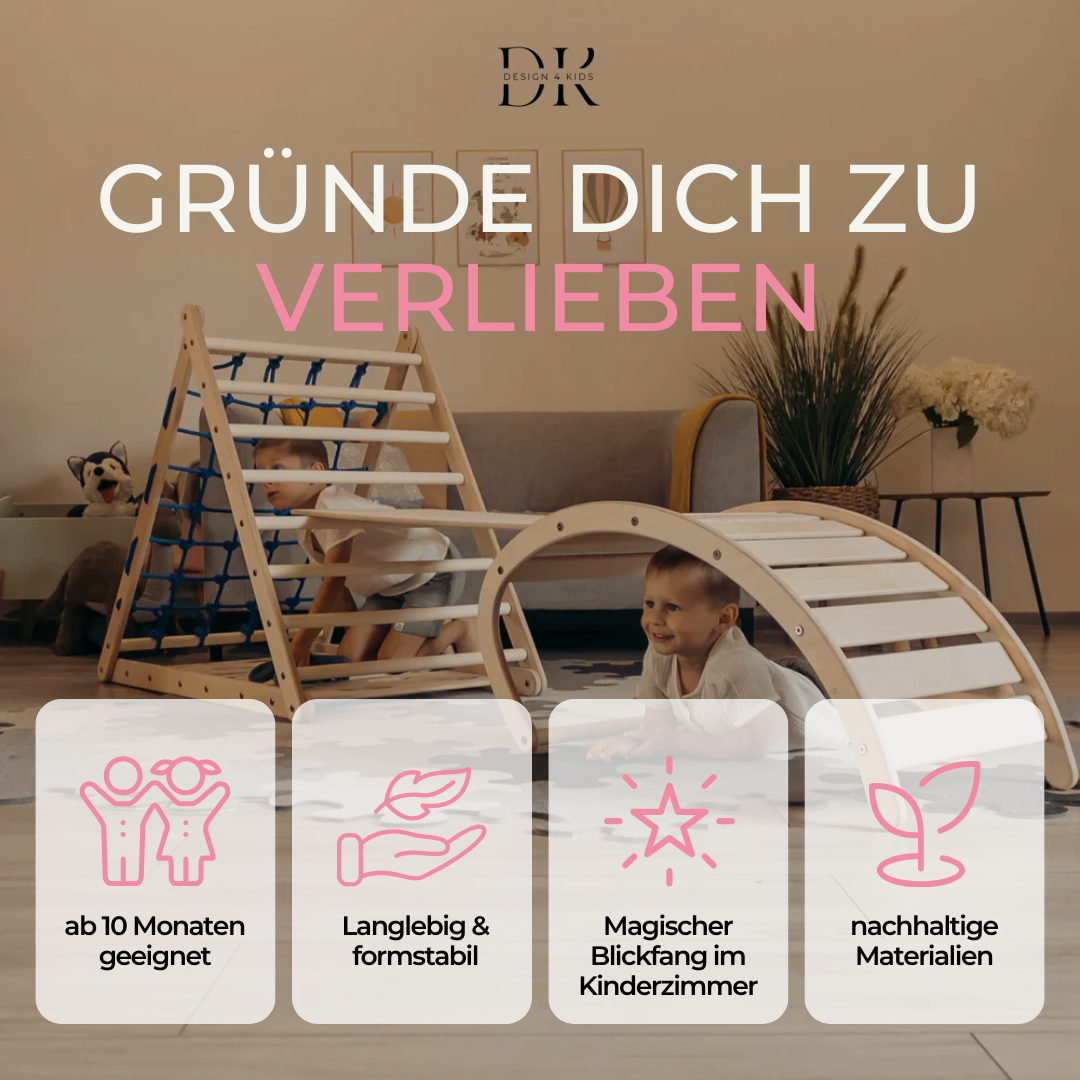 Die Klettersets bieten eine ideale Mischung aus Greifen, Steigen, Hochziehen, Rutschen, Wippen und natürlich Klettern! Es ermutigt Dein Kind zum freien Spiel, Entdecken, Erobern und Erforschen.