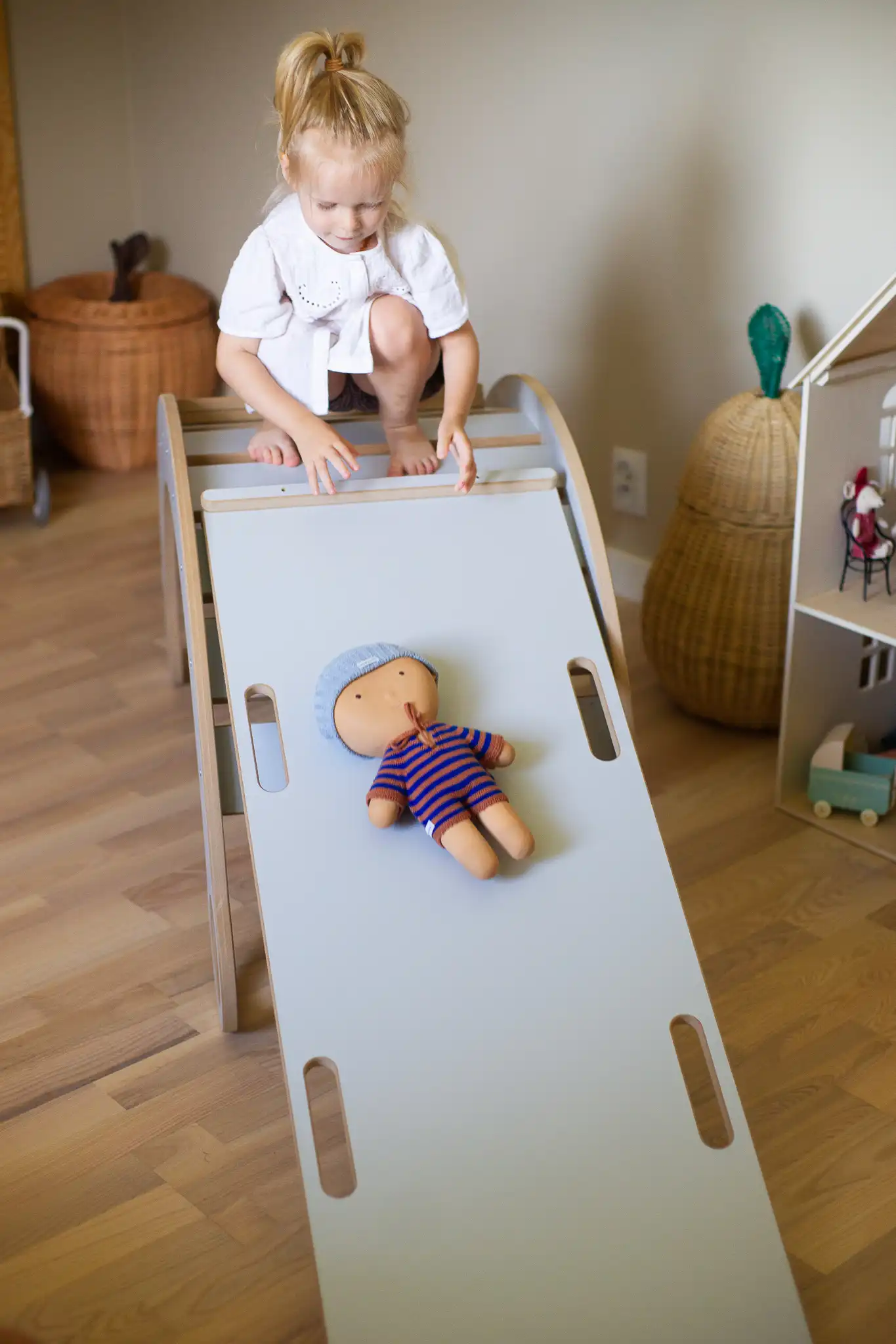 Zum Set gehört ein konturiertes Brett, das auf jeder Seite Möglichkeiten für unterschiedliche Bewegungsaktivitäten bietet. Eine Seite ist völlig glatt, so dass sie als Rutsche dienen kann. Auf der anderen Seite befindet sich eine Kletterwand. Das Brett ist außerdem mit bequemen, ergonomischen Griffen ausgestattet, die es den Kindern leicht machen, nach oben zu klettern.