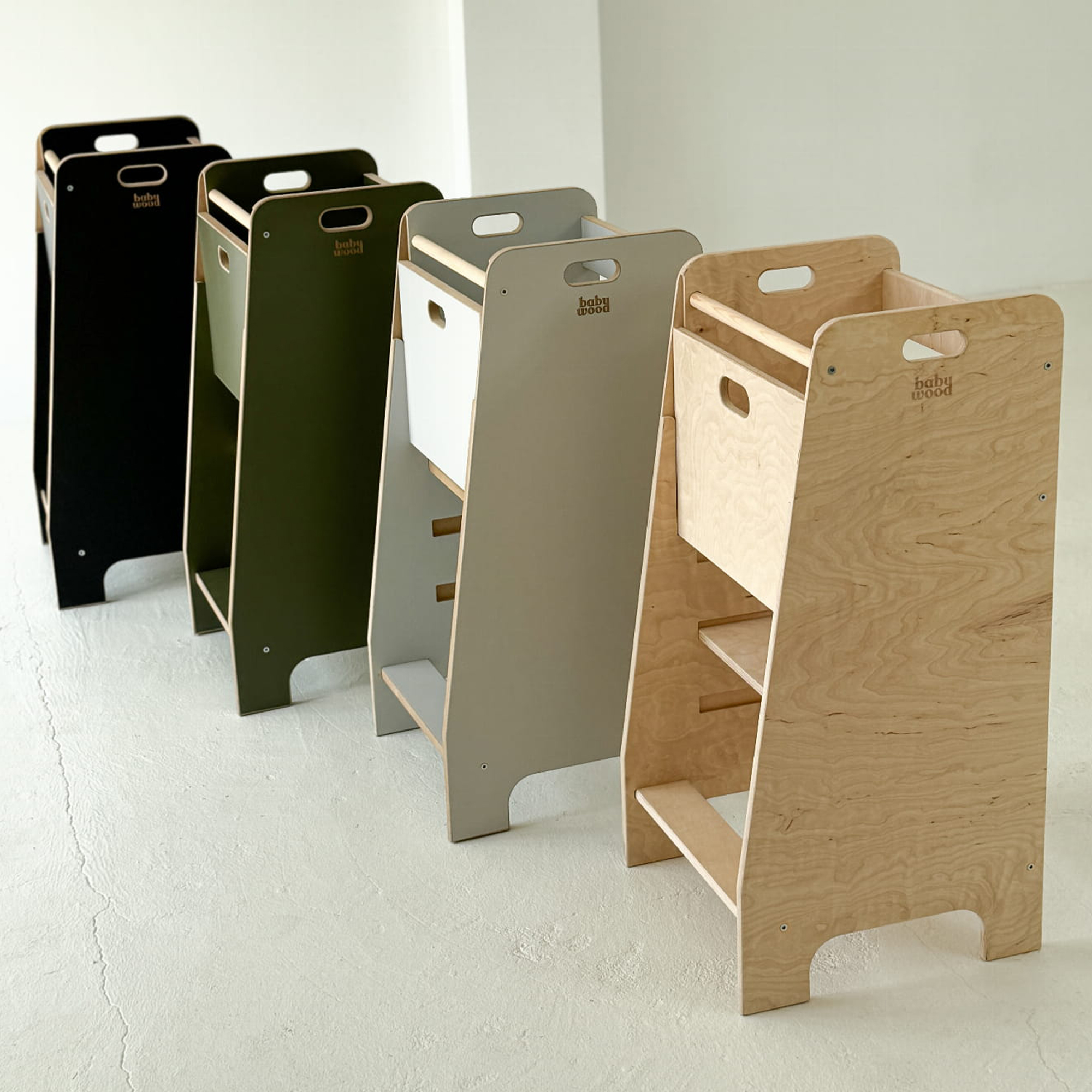 Erhältlich in sieben stilvollen Farben – natur, weiß, grau, schwarz, olivgrün, blau und rosa – fügt sich der Lernturm Comfort nahtlos in jede Küche ein.