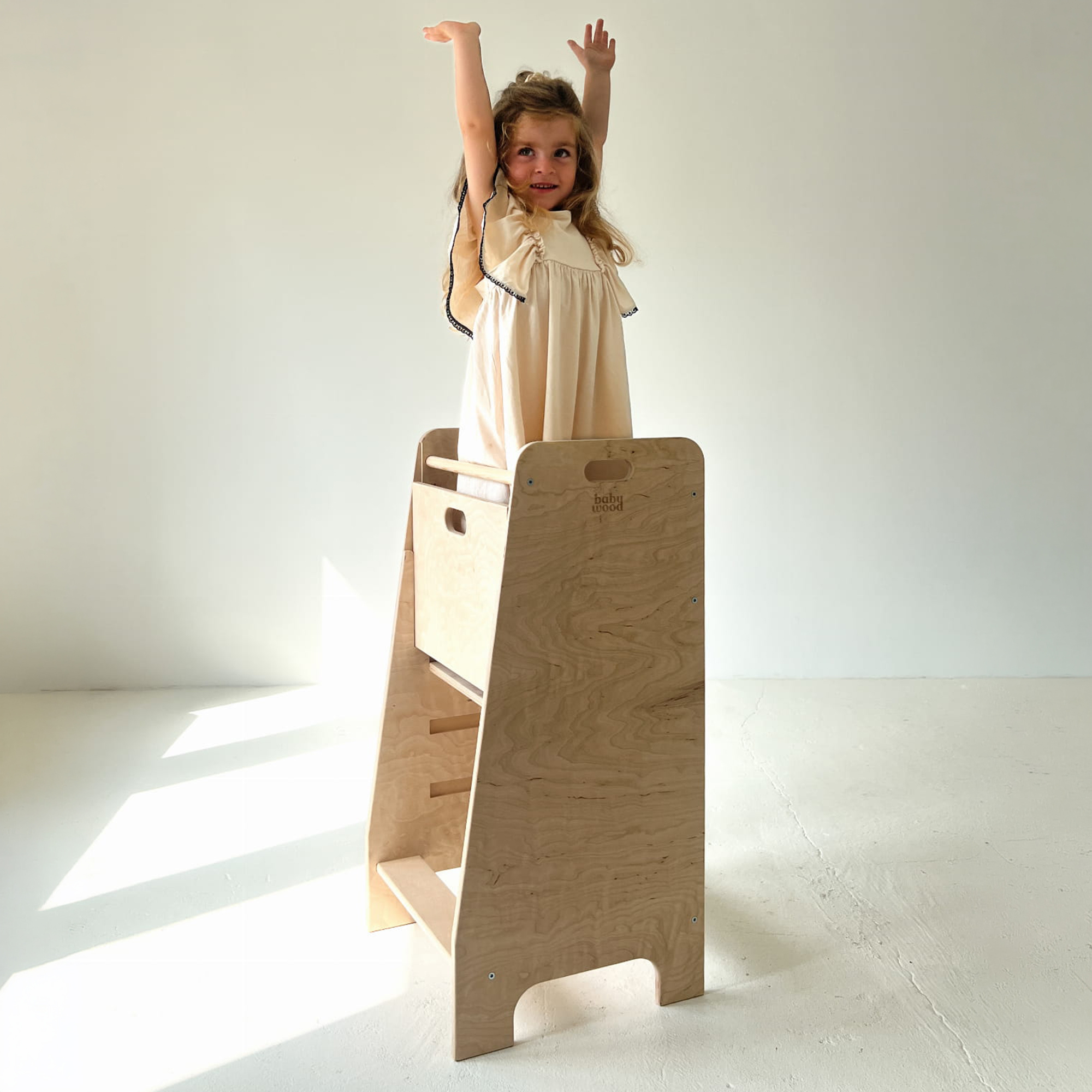 Mit der 3-stufig verstellbaren Plattform passt sich der Lernturm mühelos der Körpergröße deines Kindes an. So kann dein kleiner Küchenhelfer immer auf optimaler Höhe mitwirken – sicher und bequem.