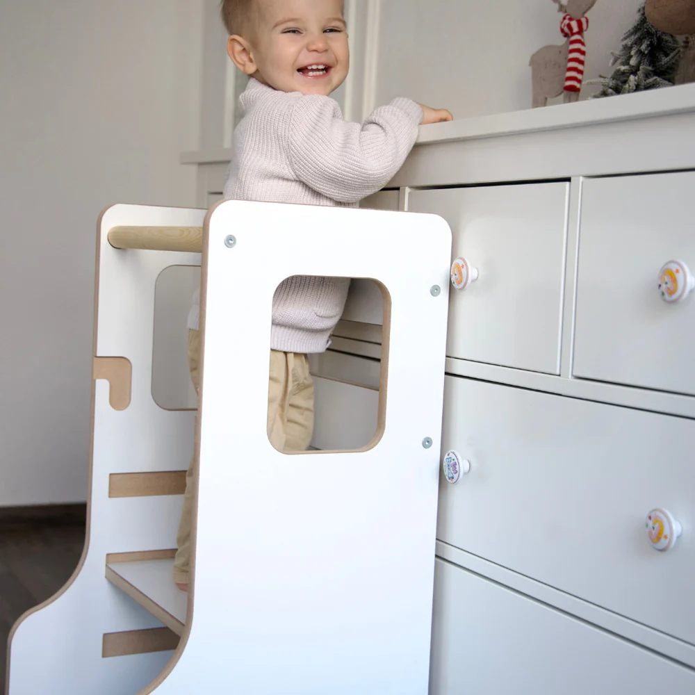 Ermögliche deinem Kind, spielerisch ein neues Maß an Selbstständigkeit zu erreichen! Der MeowBaby® Montessori Küchenhelfer ist ein stabiler und sicherer Lernturm, mit dem Kinder aktiv am Küchenalltag teilnehmen können. Dank der robusten Konstruktion und der höhenverstellbaren Plattform erreicht dein Kind mühelos Arbeitsplatte, Spüle oder Tisch – ganz ohne Hilfe von Erwachsenen.