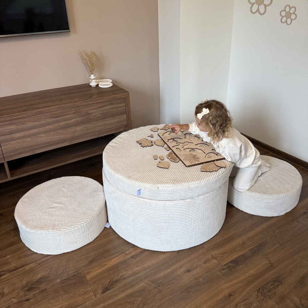 Der Spielhocker besteht aus 4 Modulen, die sich beliebig verbinden und anordnen lassen: zu einem Tisch, Sitz, Fußstütze, Tunnel oder sogar ein Bällebad.