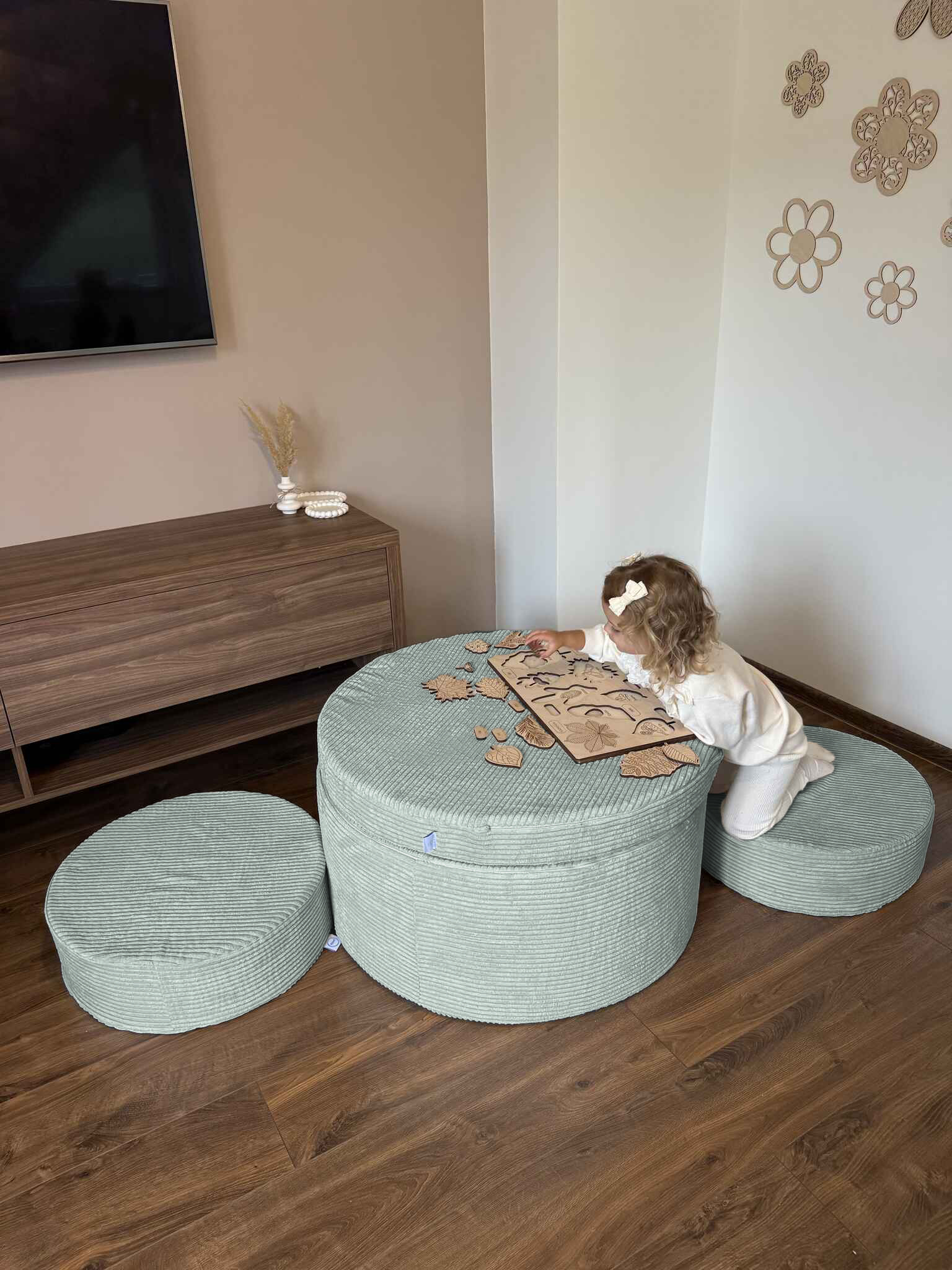 Der Spielhocker besteht aus 4 Modulen, die sich beliebig verbinden und anordnen lassen: zu einem Tisch, Sitz, Fußstütze, Tunnel oder sogar ein Bällebad.