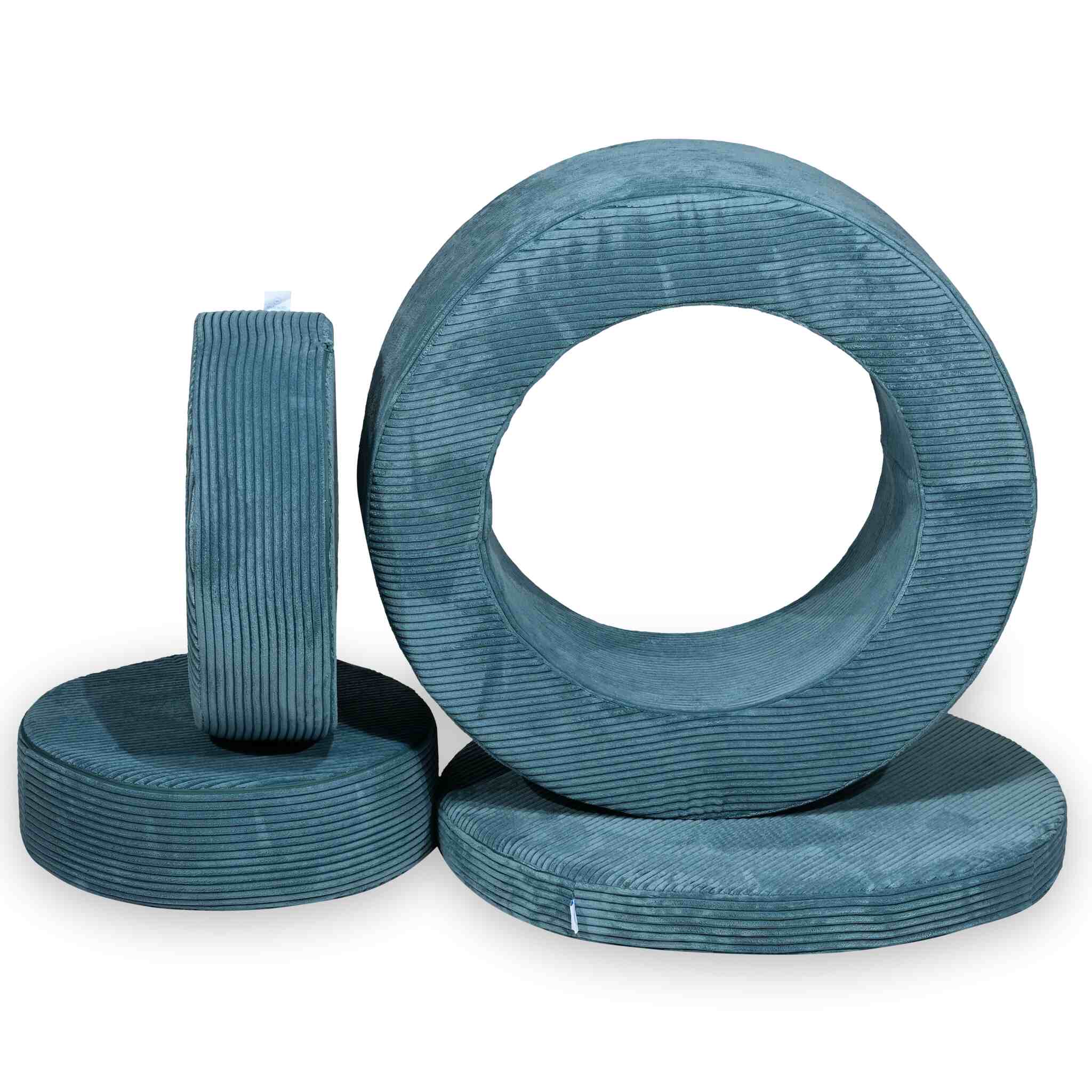 Der Spielhocker besteht aus 4 Modulen, die sich beliebig verbinden und anordnen lassen: zu einem Tisch, Sitz, Fußstütze, Tunnel oder sogar ein Bällebad.