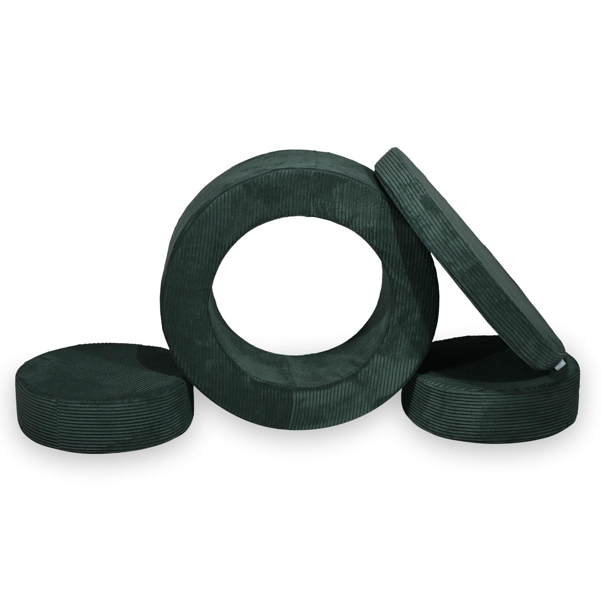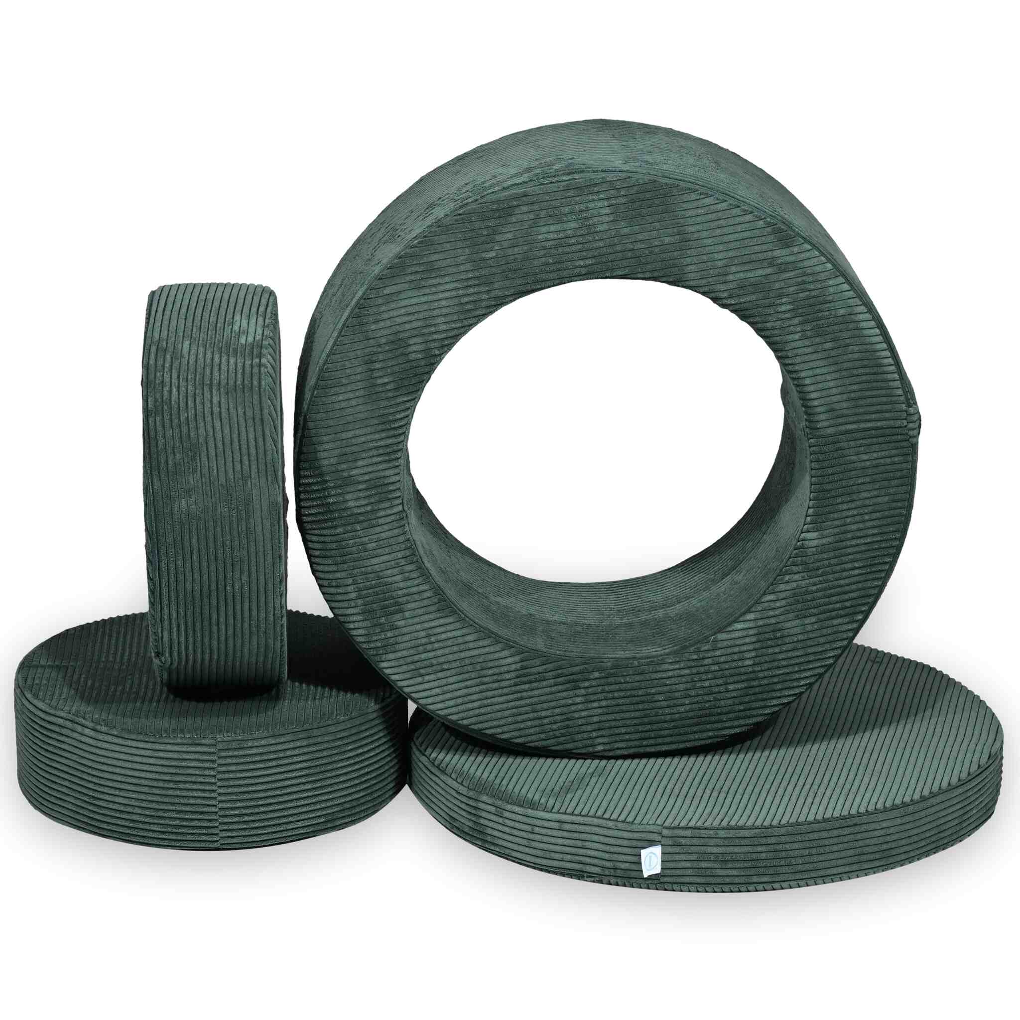 Der Spielhocker besteht aus 4 Modulen, die sich beliebig verbinden und anordnen lassen: zu einem Tisch, Sitz, Fußstütze, Tunnel oder sogar ein Bällebad.
