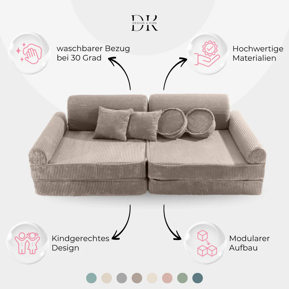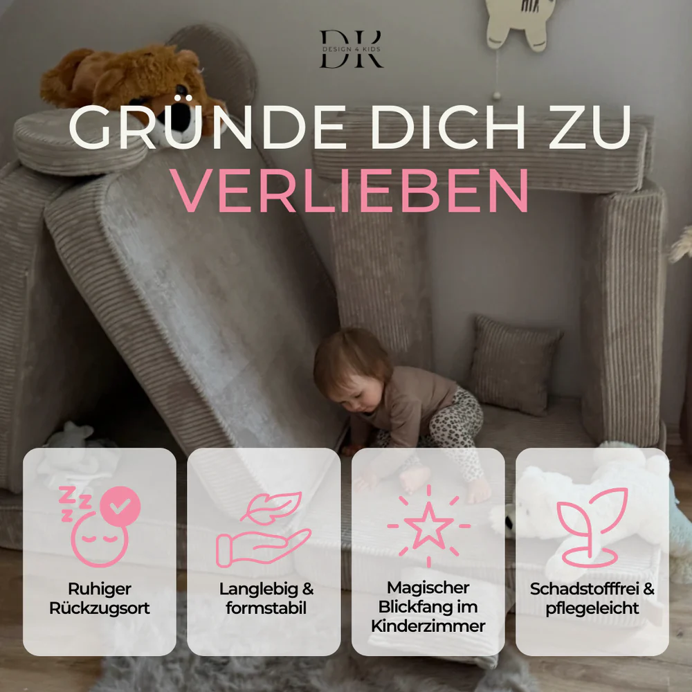 Das Design4Kids® Spielsofa unterstützt die motorische und sensorische Entwicklung sowie die Kreativität deines Kindes. Es bietet einen vielseitigen Spielplatz, der Raum für Abenteuer, Entspannung und soziale Interaktionen schafft.