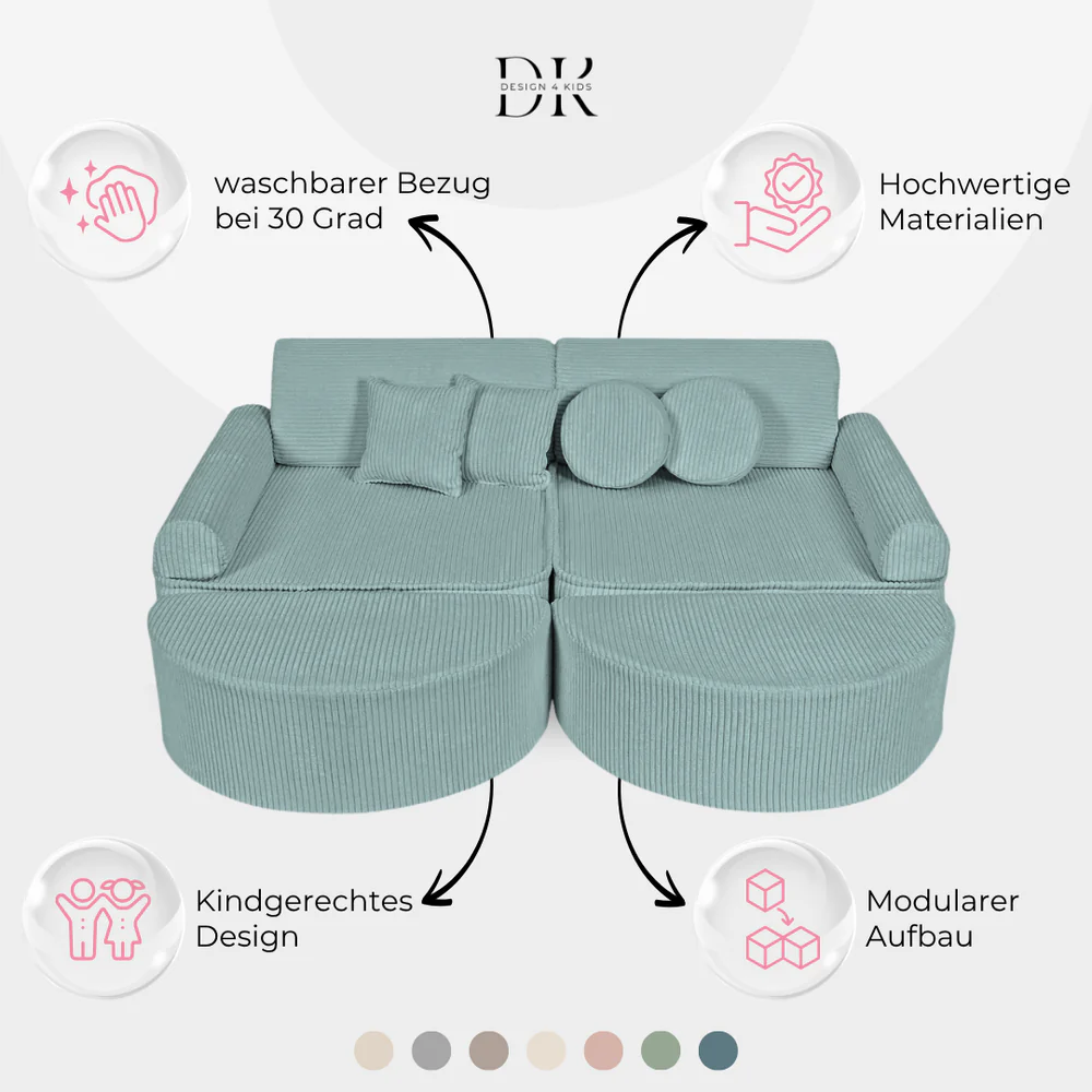 Bei Design4Kids wird großer Wert darauf gelegt, Spielsofas zu entwickeln, die sich durch Qualität und Design abheben. Im Vergleich zu preisgünstigeren Alternativen, die auf dem Markt verbreitet sind, und preisintensiveren Modellen, die das Budget sprengen können, bieten wir eine ausgewogene Lösung. Unser Ziel ist es, ein hochwertiges Produkt zu schaffen, das die ganze Familie begeistert – mit viel Liebe zum Detail, edlen Stoffen und makellosen Nähten.