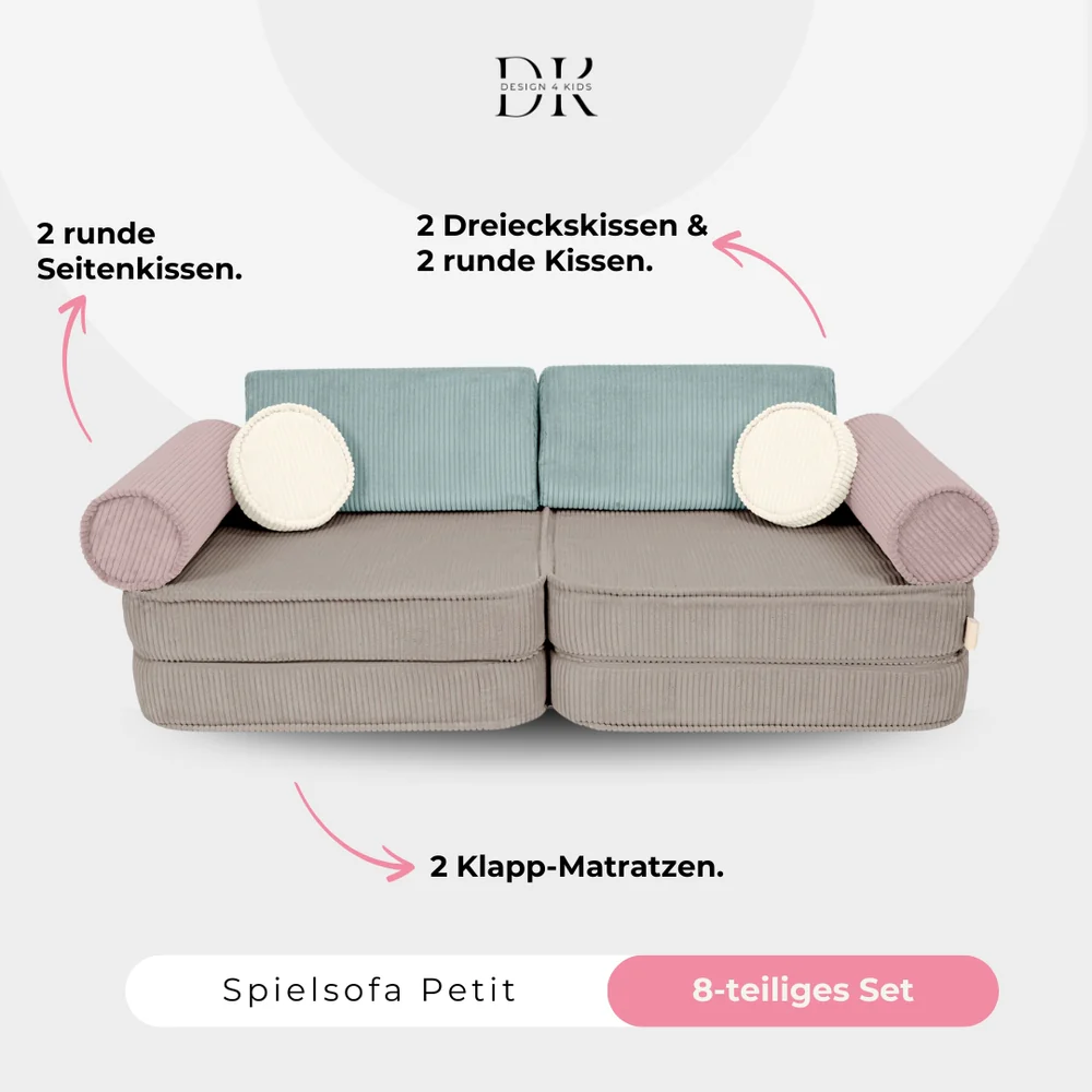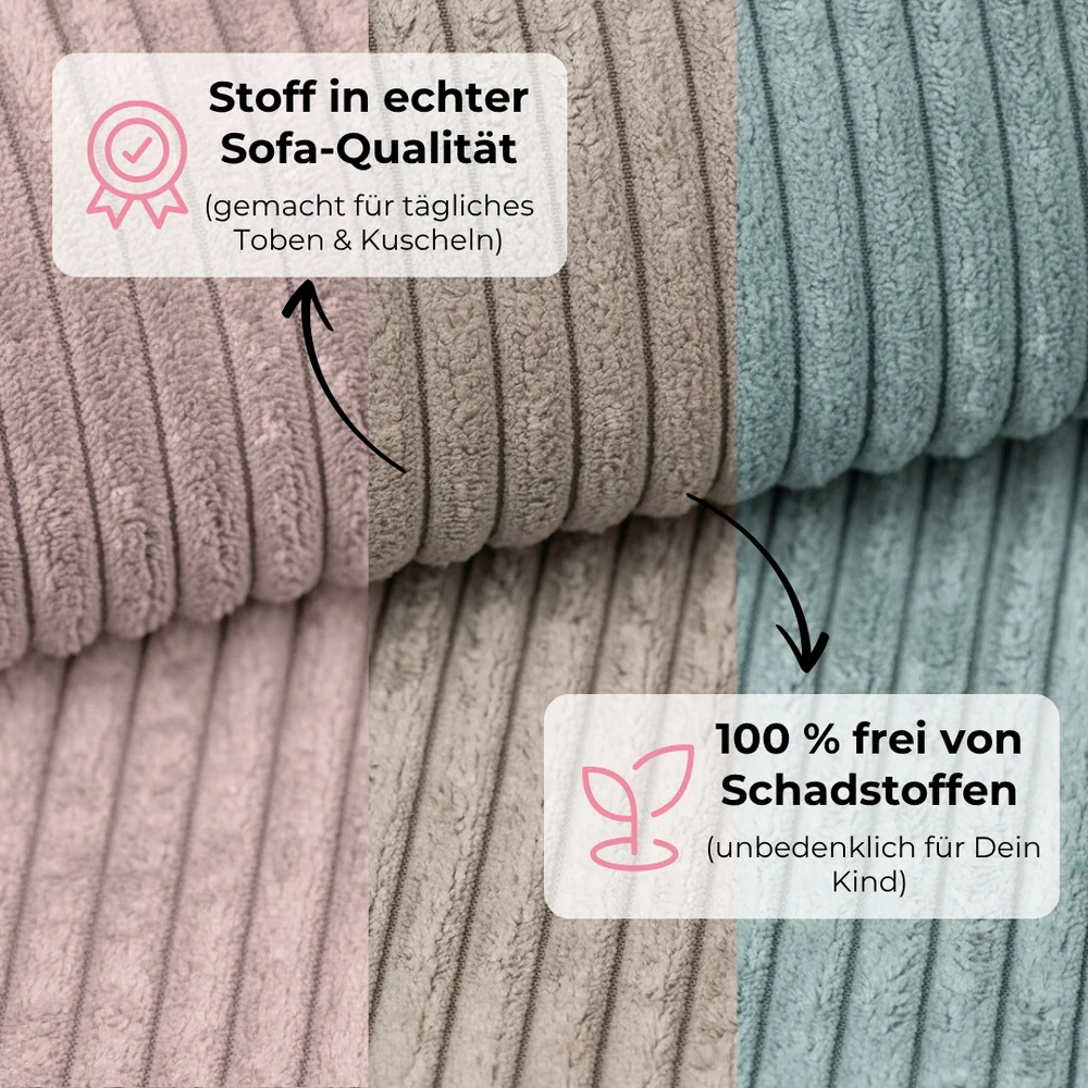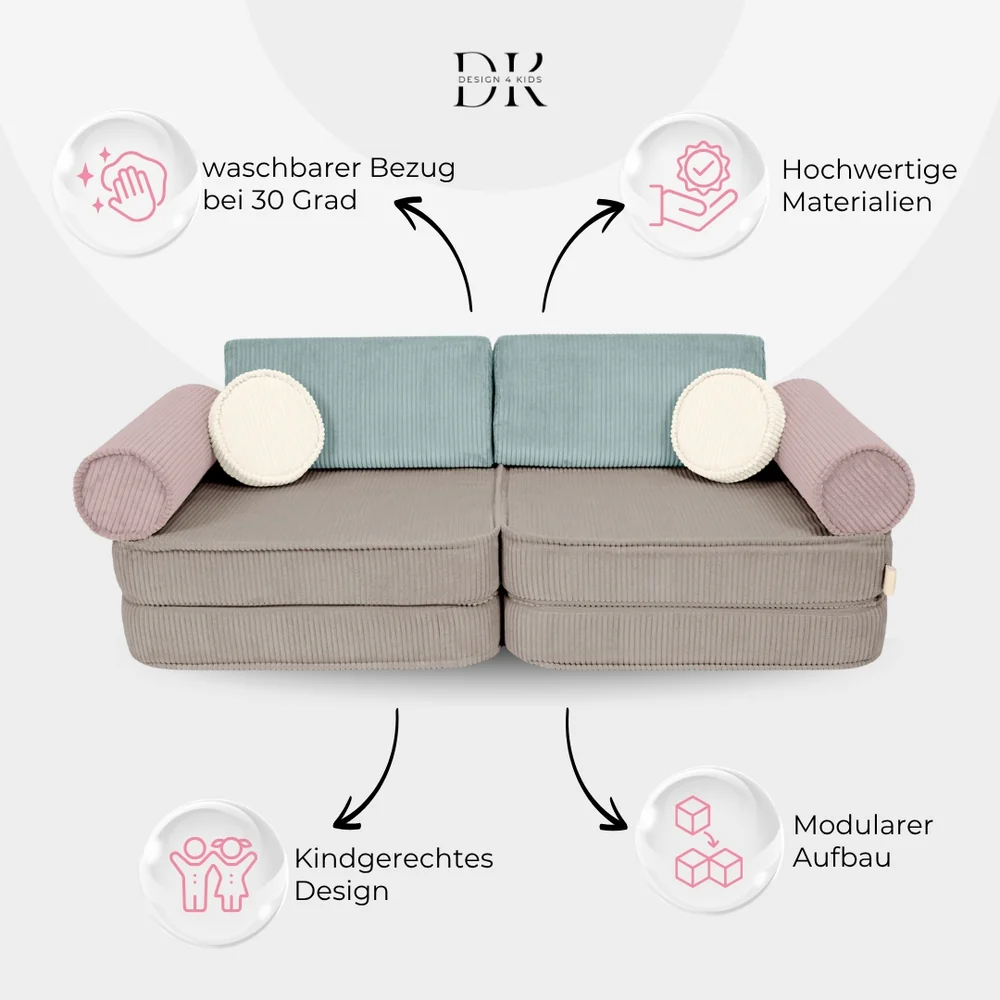 Bei Design4Kids wird großer Wert darauf gelegt, Spielsofas zu entwickeln, die sich durch Qualität und Design abheben. Im Vergleich zu preisgünstigeren Alternativen, die auf dem Markt verbreitet sind, und preisintensiveren Modellen, die das Budget sprengen können, bieten wir eine ausgewogene Lösung. Unser Ziel ist es, ein hochwertiges Produkt zu schaffen, das die ganze Familie begeistert – mit viel Liebe zum Detail, edlen Stoffen und makellosen Nähten.