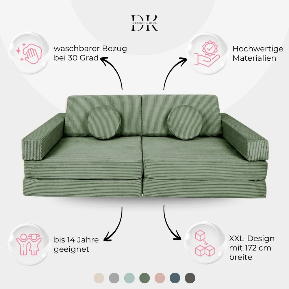 Bei Design4Kids wird großer Wert darauf gelegt, Spielsofas zu entwickeln, die sich durch Qualität und Design abheben. Im Vergleich zu preisgünstigeren Alternativen, die auf dem Markt verbreitet sind, und preisintensiveren Modellen, die das Budget sprengen können, bieten wir eine ausgewogene Lösung. Unser Ziel ist es, ein hochwertiges Produkt zu schaffen, das die ganze Familie begeistert – mit viel Liebe zum Detail, edlen Stoffen und makellosen Nähten.