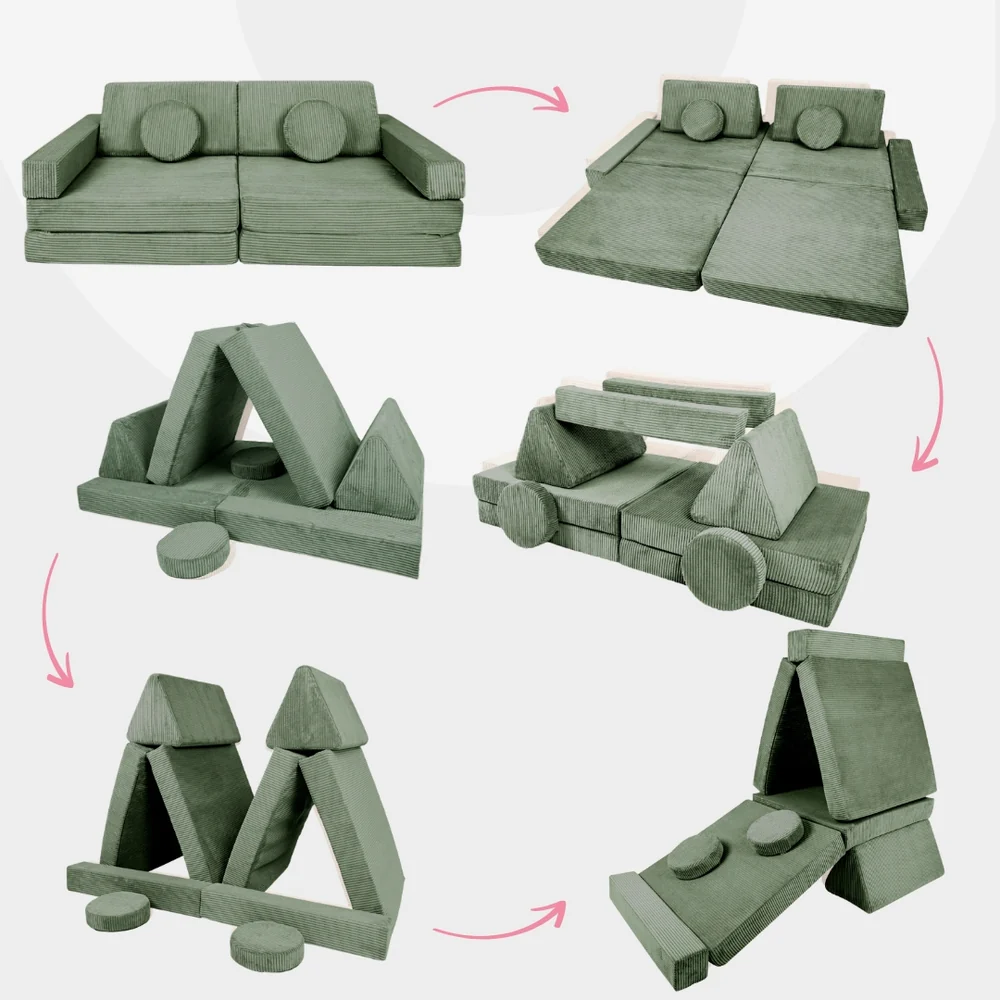 Das Design4Kids Sofa überzeugt durch eine durchdachte Konstruktion, bei der die Bodenkissen miteinander vernäht sind. Dadurch entstehen zwei separate Elemente, die jeweils aus zwei Kissen bestehen. Diese Verbindung sorgt nicht nur für maximalen Komfort beim Schlafen, sondern bietet auch Stabilität und Halt beim Spielen. Der speziell verwendete Stoff erzeugt zudem eine natürliche Reibung, die die Teile zusammenhält und ein sicheres, reibungsloses Spielerlebnis ermöglicht.
