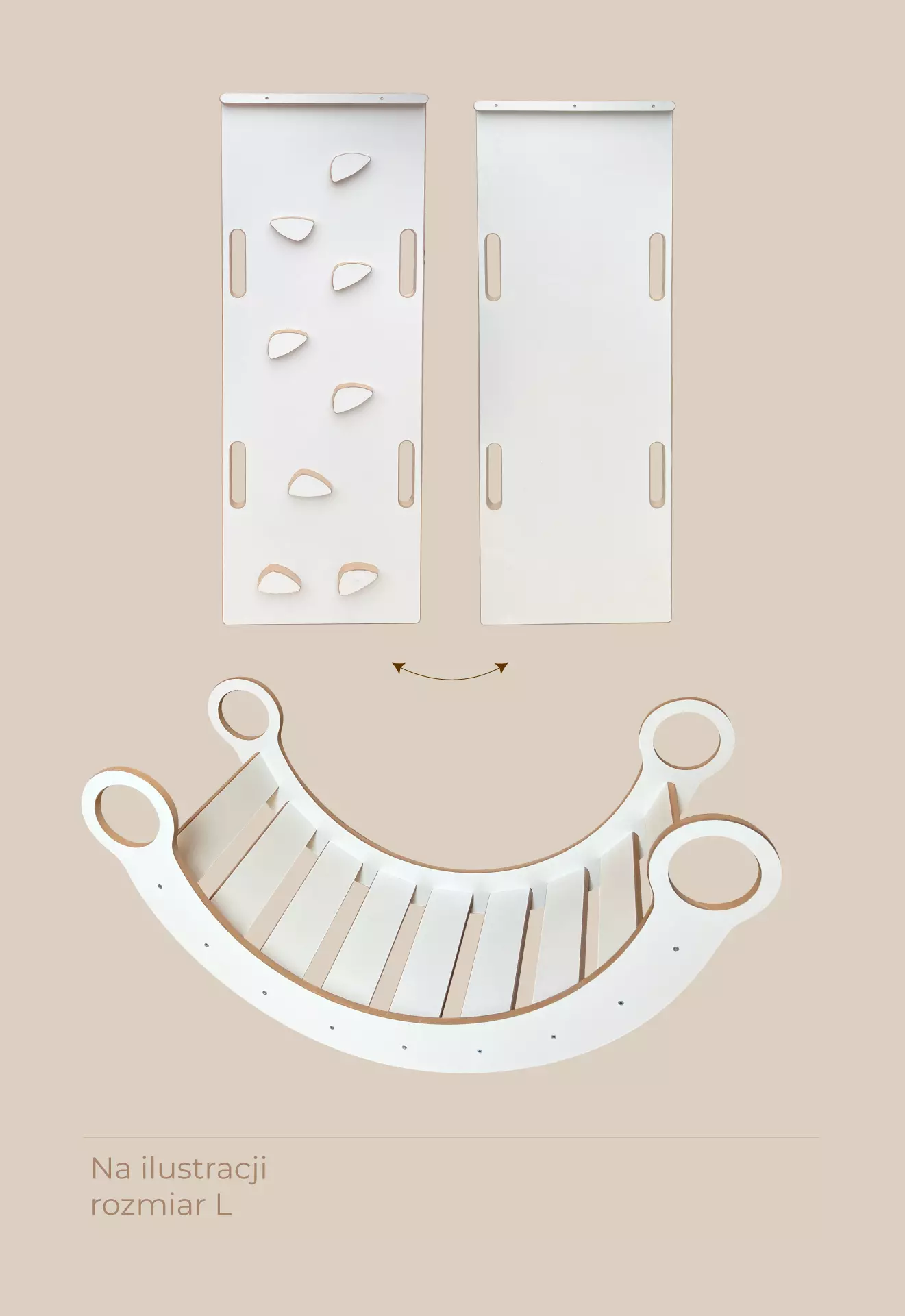 Zum Set gehört ein konturiertes Brett, das auf jeder Seite Möglichkeiten für unterschiedliche Bewegungsaktivitäten bietet. Eine Seite ist völlig glatt, so dass sie als Rutsche dienen kann. Auf der anderen Seite befindet sich eine Kletterwand. Das Brett ist außerdem mit bequemen, ergonomischen Griffen ausgestattet, die es den Kindern leicht machen, nach oben zu klettern.