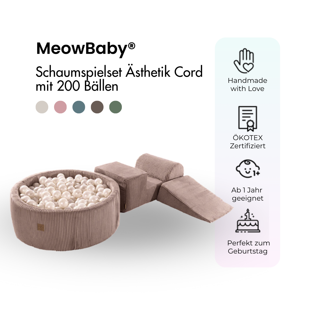 MeowBaby Schaumspielset Ästhetik Cord khaki mit Bällebad und 200 Bälle