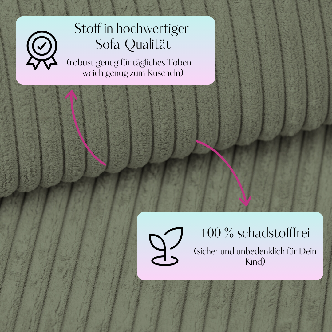 • Weicher Cord: Die sorgfältig ausgewählten Materialien gewährleisten eine lange Lebensdauer und einfache Pflege. Das bedeutet weniger Sorgen für dich und mehr Gemütlichkeit für deine Kleinen.