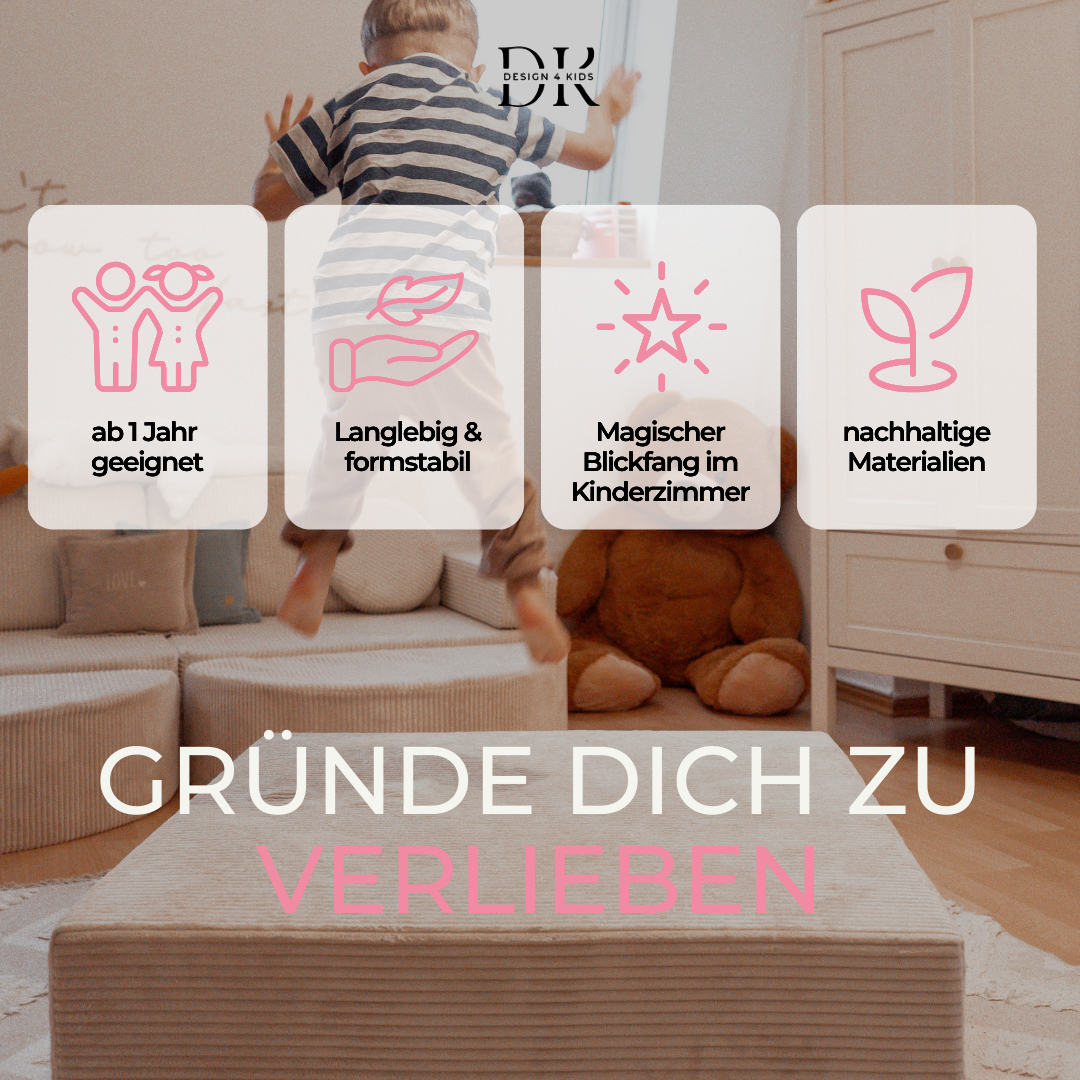 Der strapazierfähige Cord-Bezug ist angenehm weich und hält auch intensivem Spielen stand. Der hochwertige PUR-Schaumstoffkern sorgt für Stabilität und langlebige Sprungkraft.