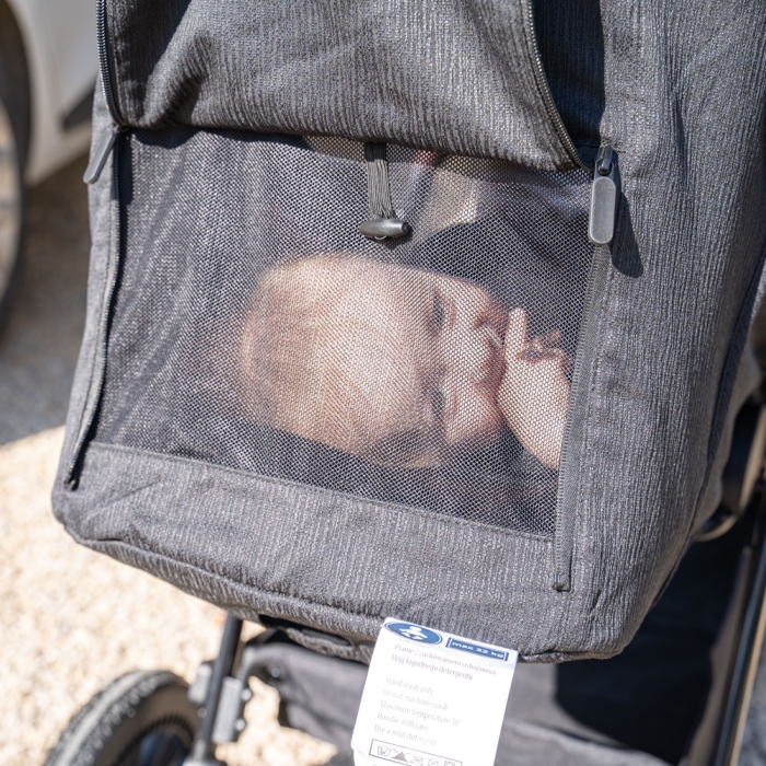 - Beobachtungsfenster: Ein Fenster mit Netz im Verdeck erleichtert die Belüftung und ermöglicht die Beobachtung unseres Babys, wenn es während eines Spaziergangs einschläft.