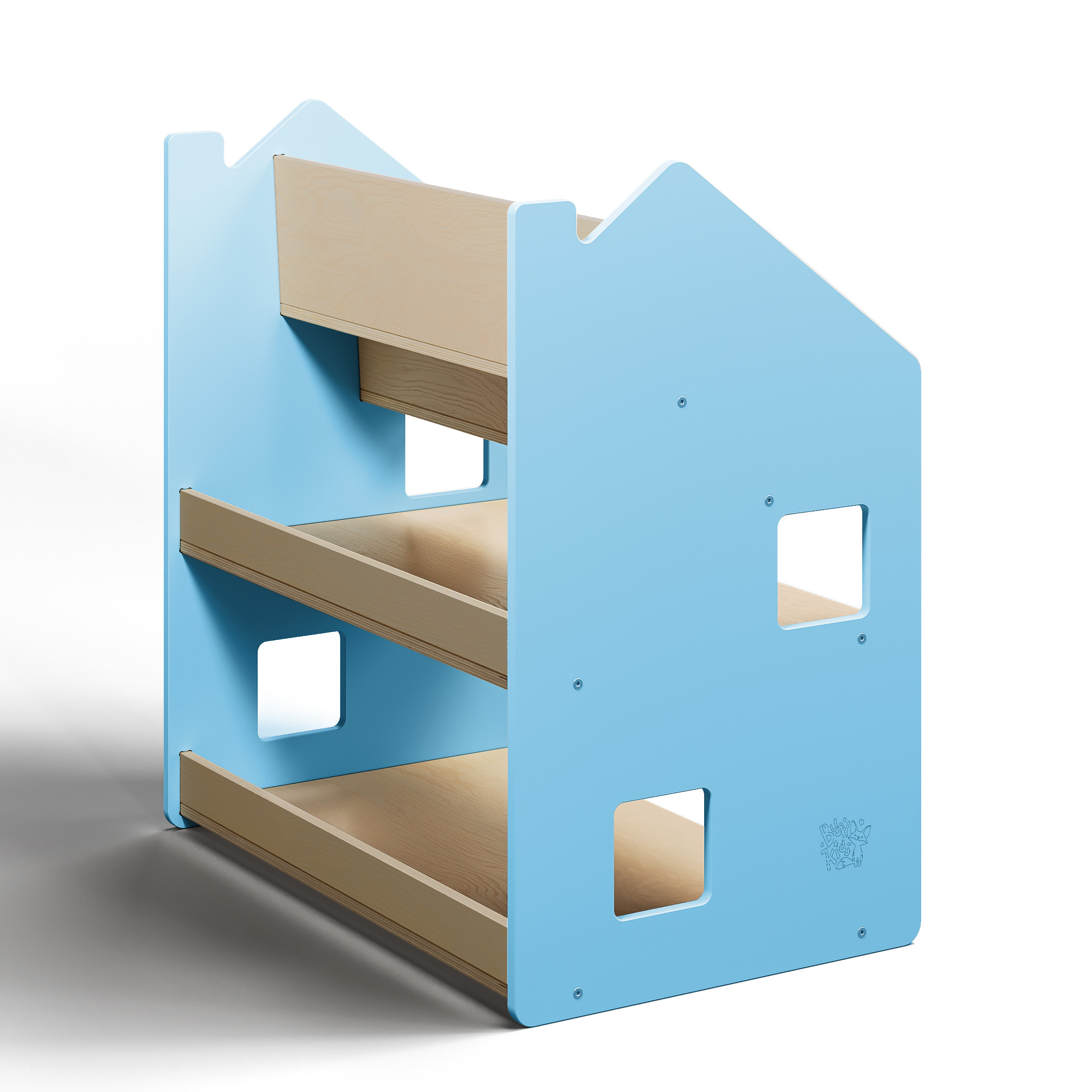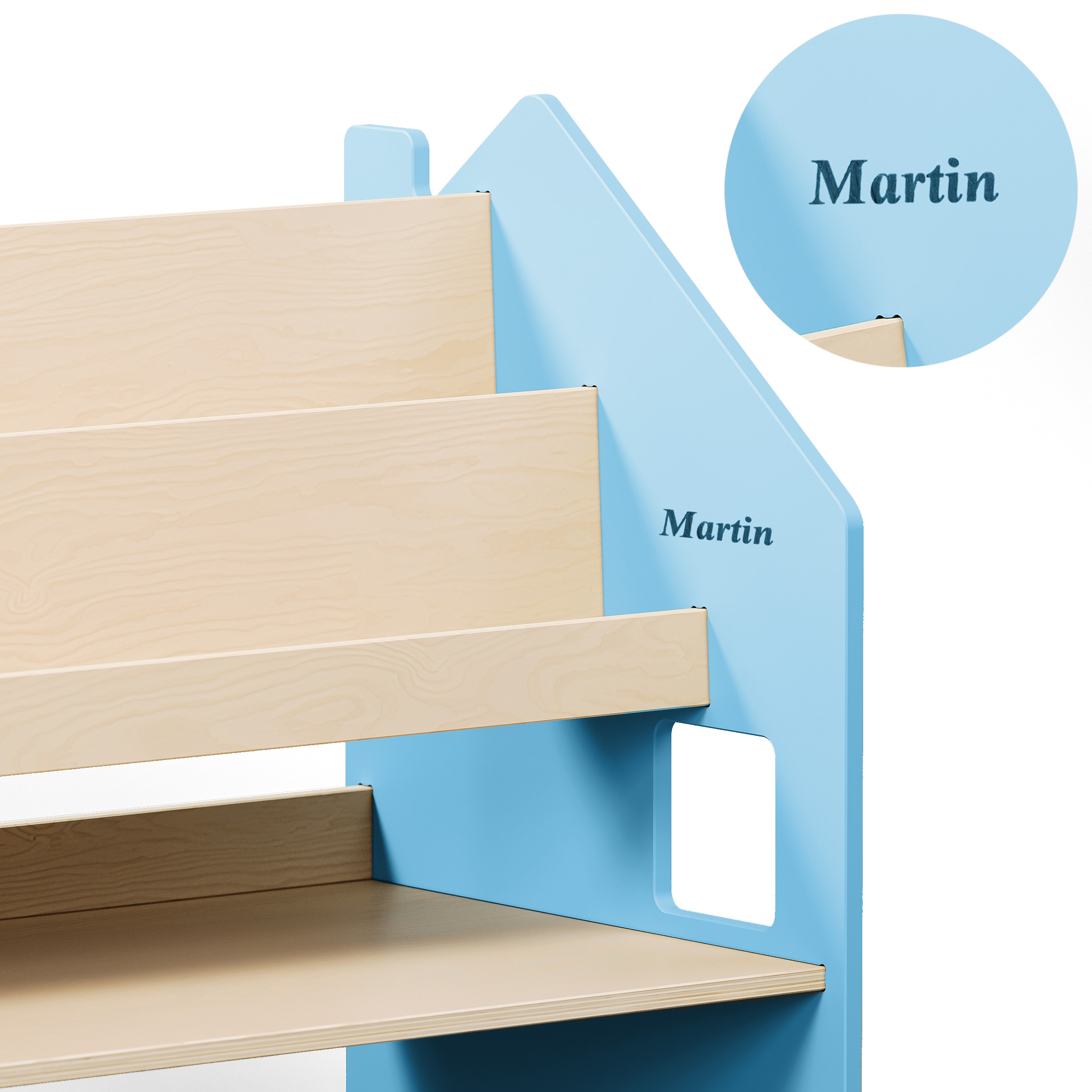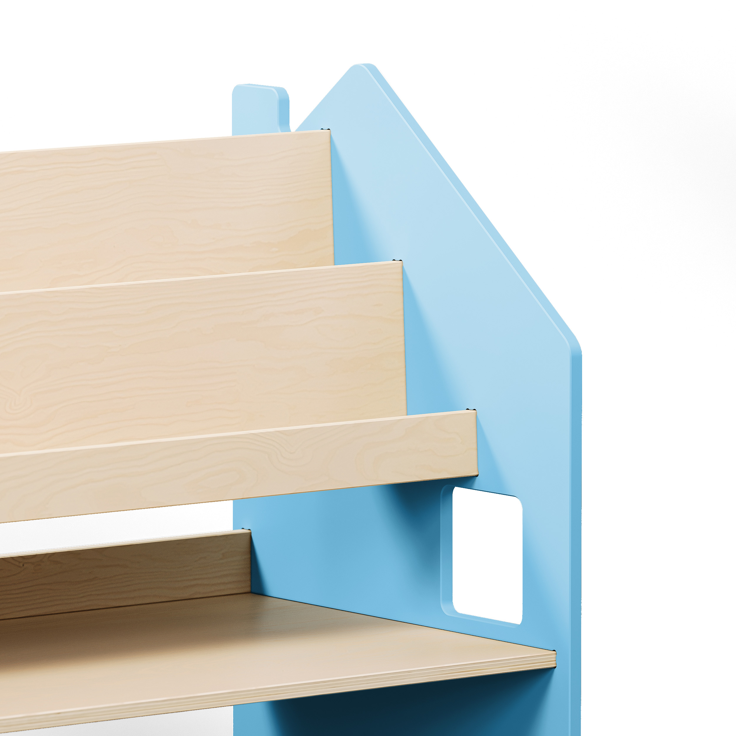 Mit seinem schlichten, kindgerechten Design passt das Regal in jedes moderne Kinderzimmer. Die Kombination aus farbigen MDF-Seitenwänden und lackiertem Birkensperrholz sorgt für eine ästhetische, stabile und sichere Lösung. Alle Ecken und Kanten sind abgerundet – für maximale Sicherheit beim täglichen Gebrauch.