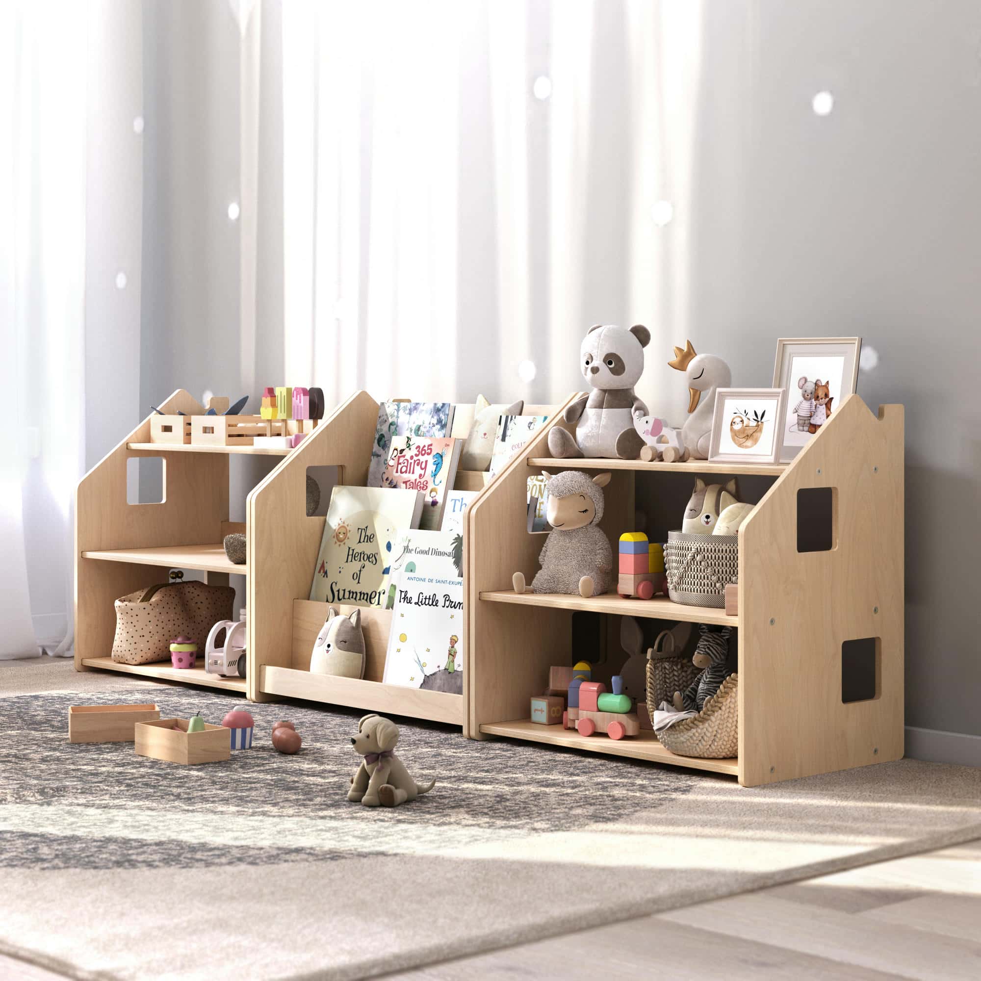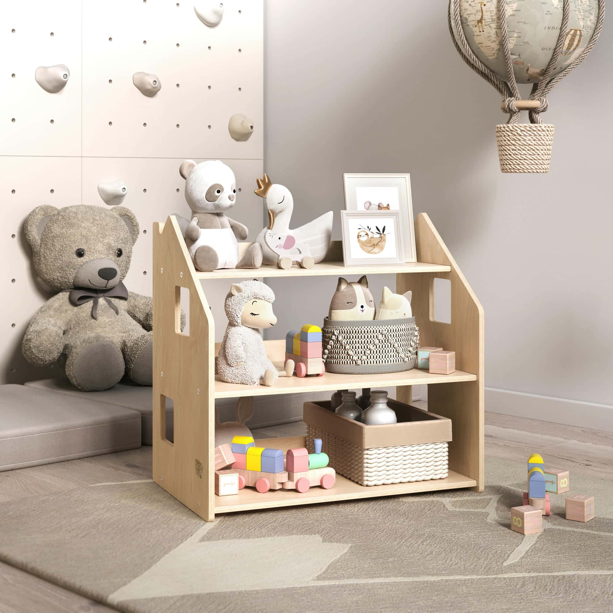 Das Spielzeugregal verfügt über drei offene Fächer, in denen das Lieblingsspielzeug einfach einsortiert werden kann. Das Spielzeugregal hat eine bequeme Größe, die Ihr Kind ohne Hilfe eines Erwachsenen nutzen kann: die Spielsachen ordnen, herausnehmen, spielen und zurückstellen. Dies stärkt die Eigenverantwortung, fördert das Individualismus und die Entwicklung eines strukturierten Ordnungssinns.