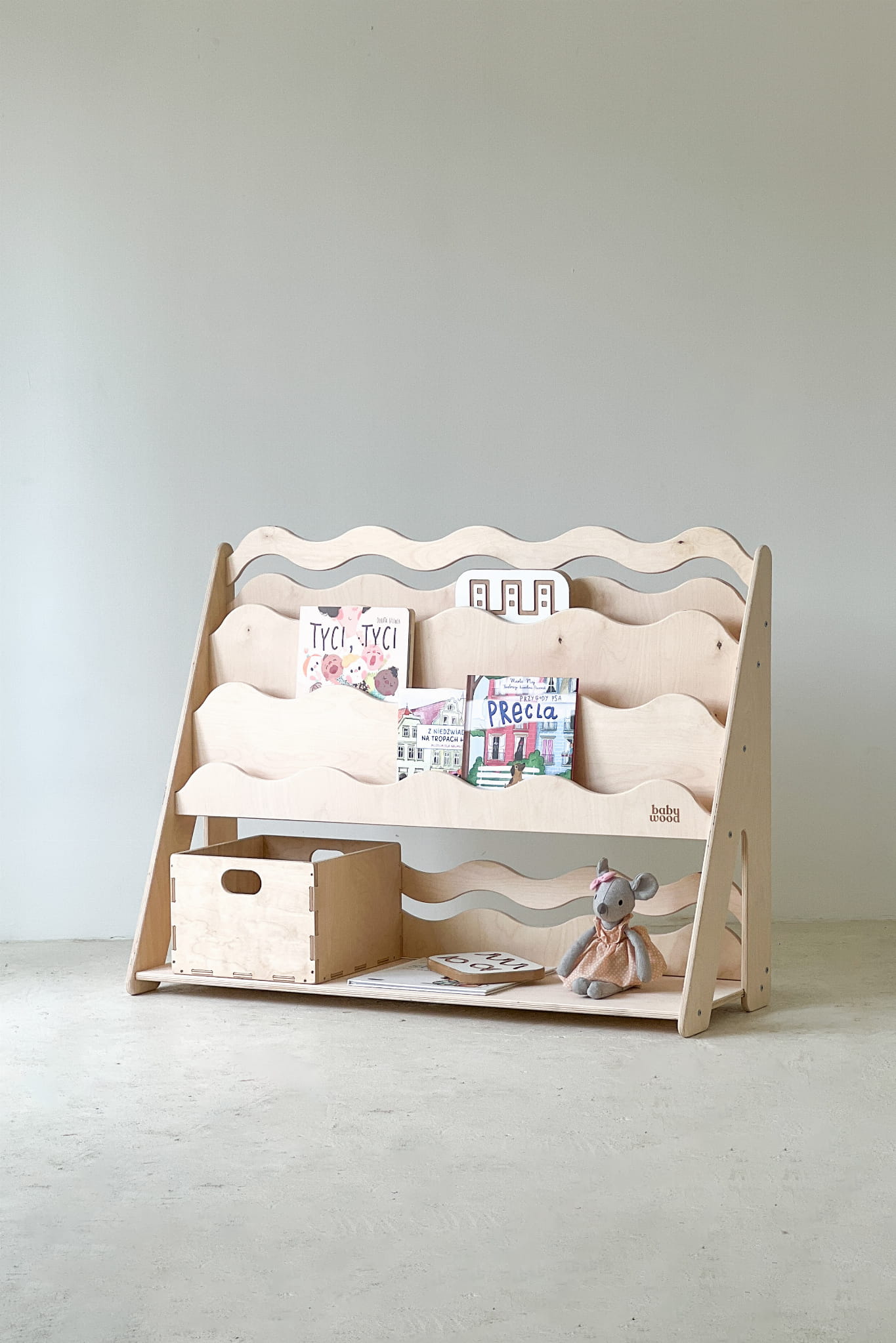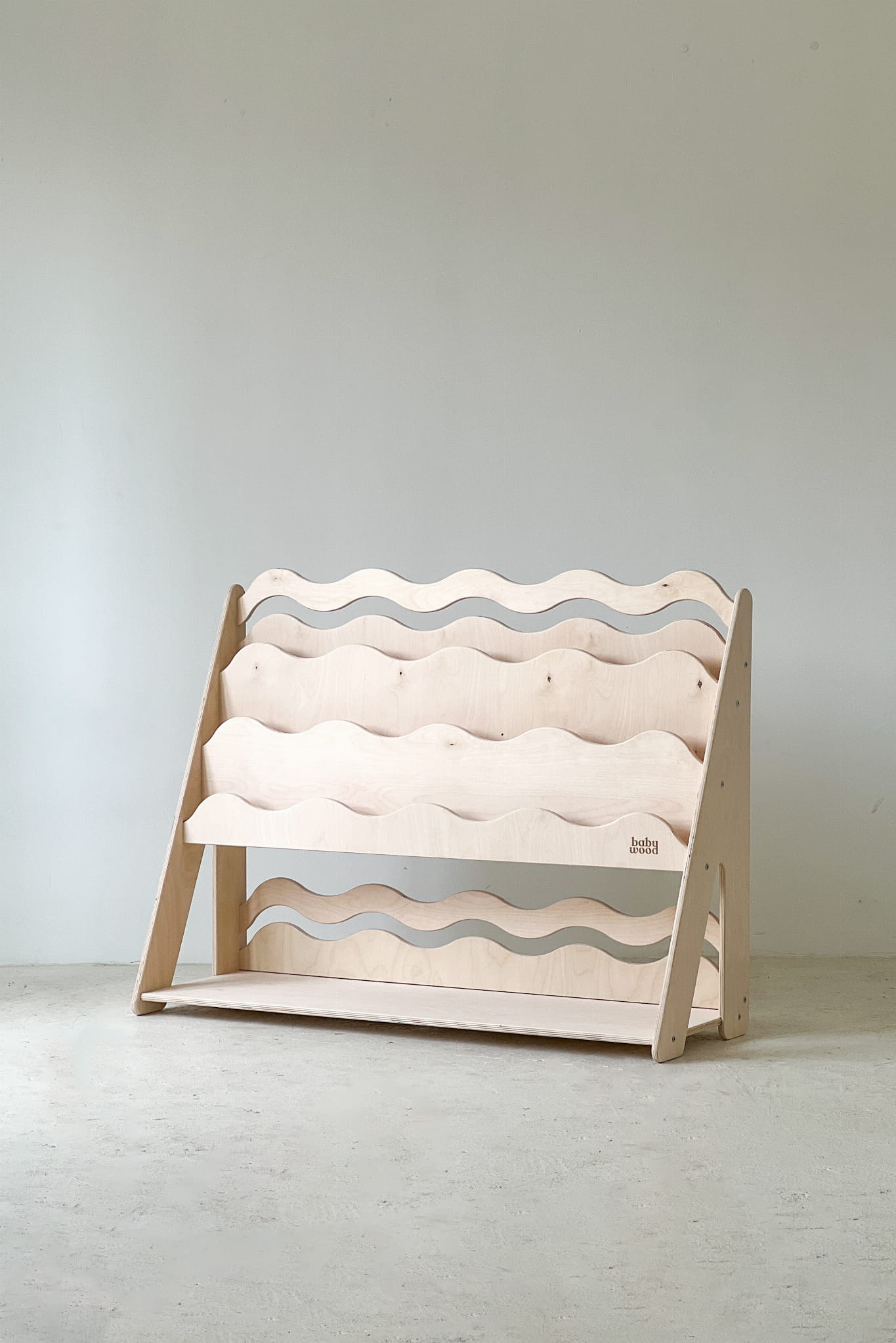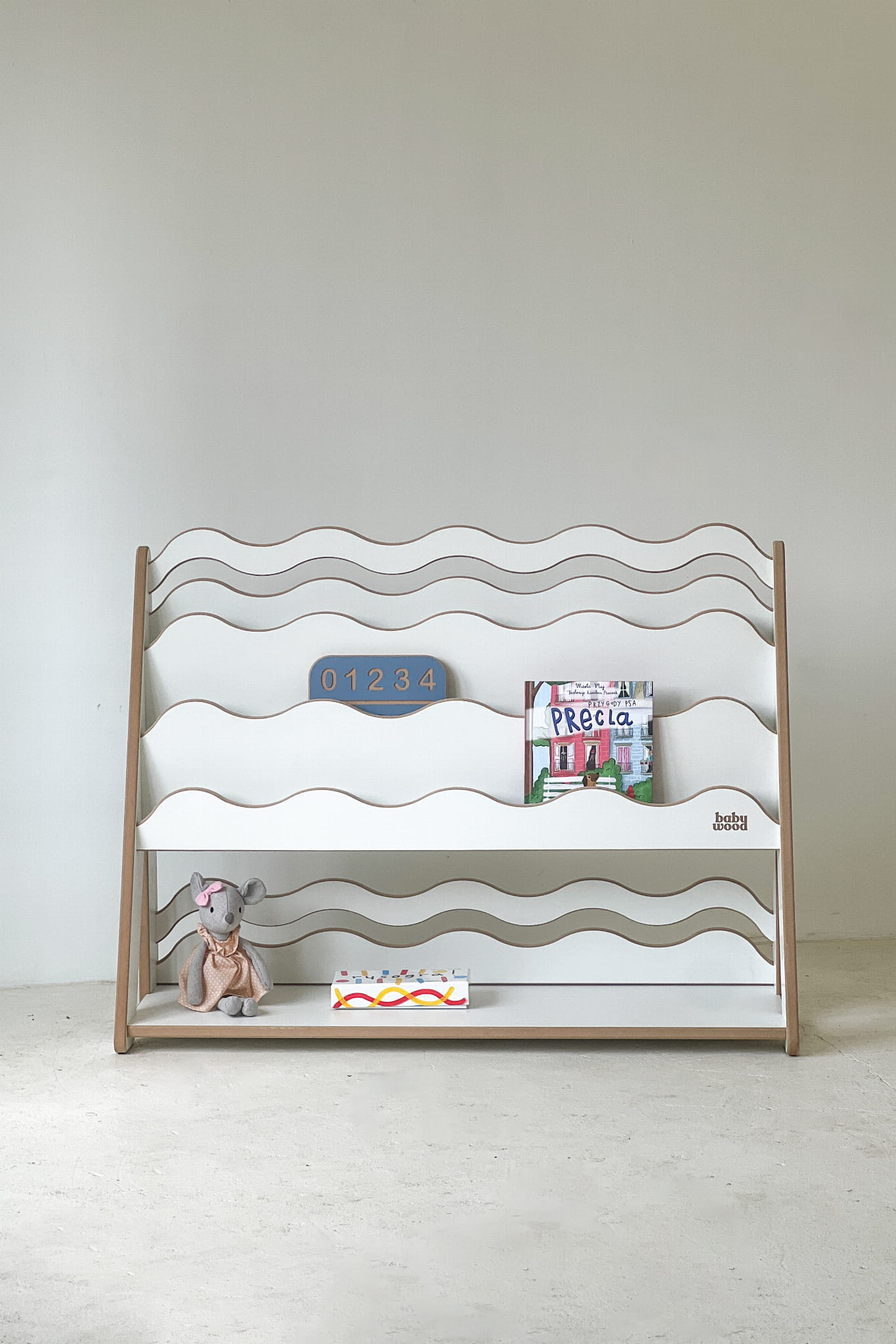 Das Bücher- und Spielzeugregal WAVE vereint zwei Funktionen in einem – Bücherregal und Aufbewahrungseinheit. Es wurde speziell für Eltern entwickelt, die im Kinderzimmer Platz sowohl für Bücher als auch für Spielzeug schaffen möchten, ohne dafür zwei Möbelstücke aufstellen zu müssen.