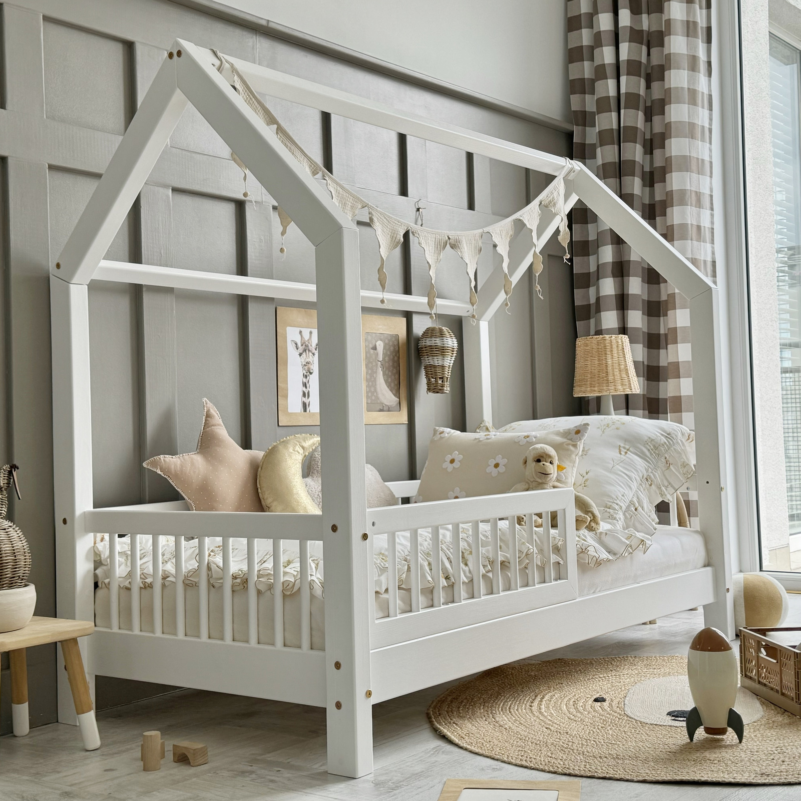 Dieses Hüttenbett kombiniert skandinavische Eleganz mit Komfort und Sicherheit. Bestelle jetzt und schaffe Deinem Kind eine gemütliche, sichere und stilvolle Schlafumgebung!