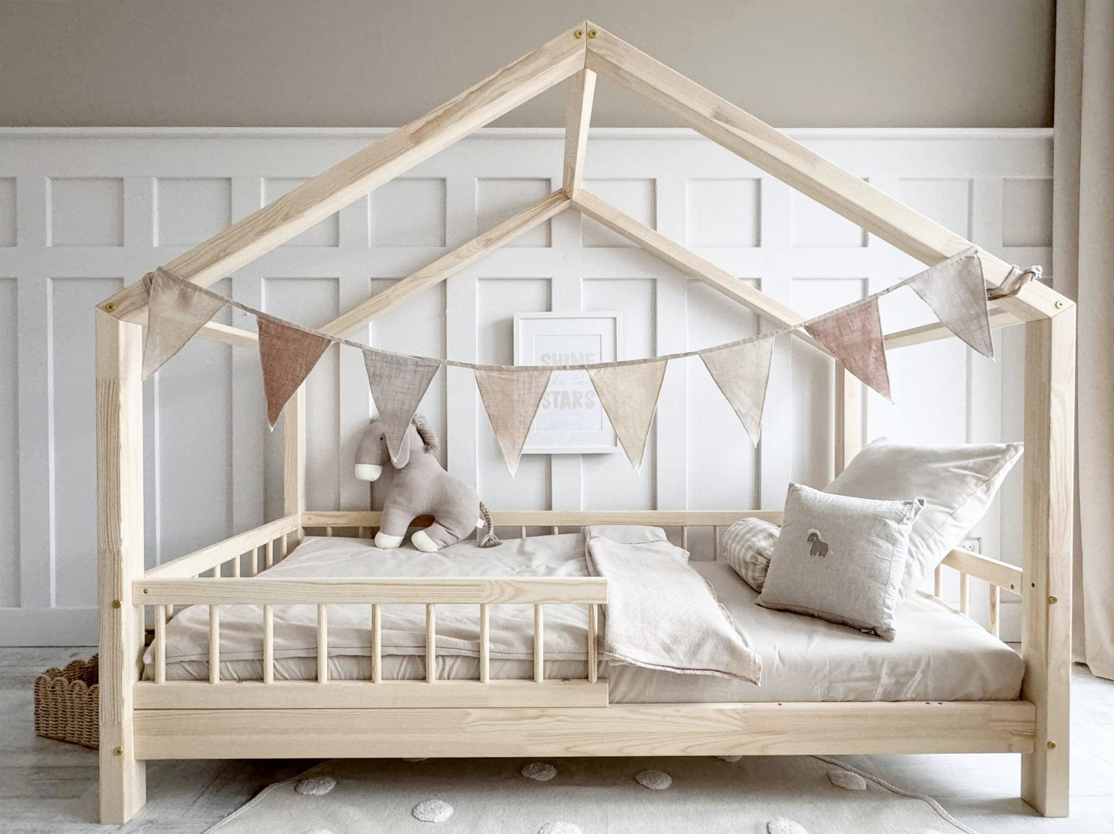 Das Bett wird aus hochwertigem Kiefernsperrholz gefertigt, das für seine Robustheit und Langlebigkeit bekannt ist. Alle Kanten sind glatt geschliffen und abgerundet, um Deinem Kind Sicherheit und Komfort zu bieten.
