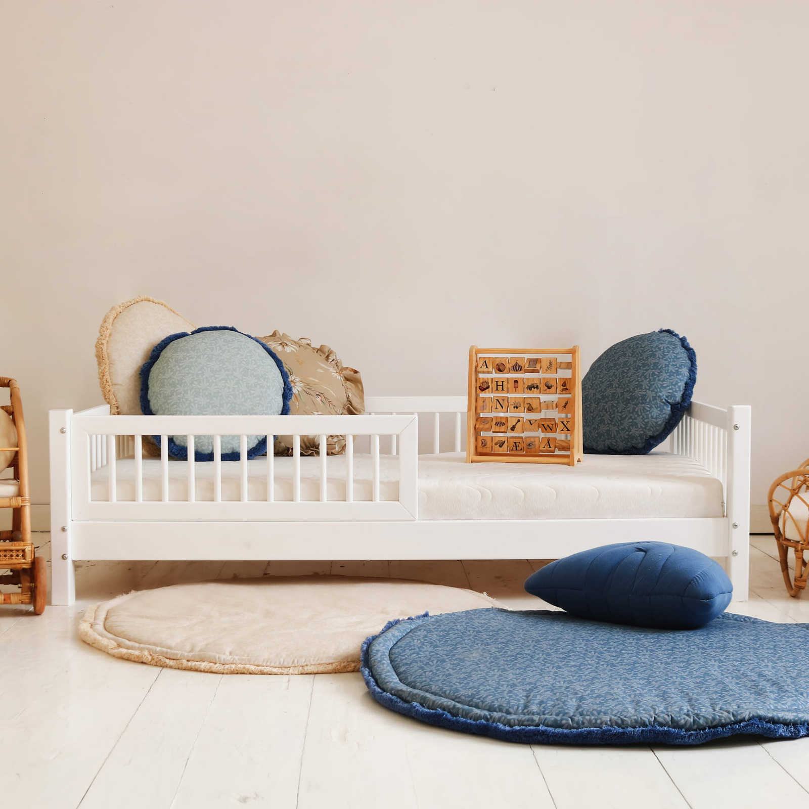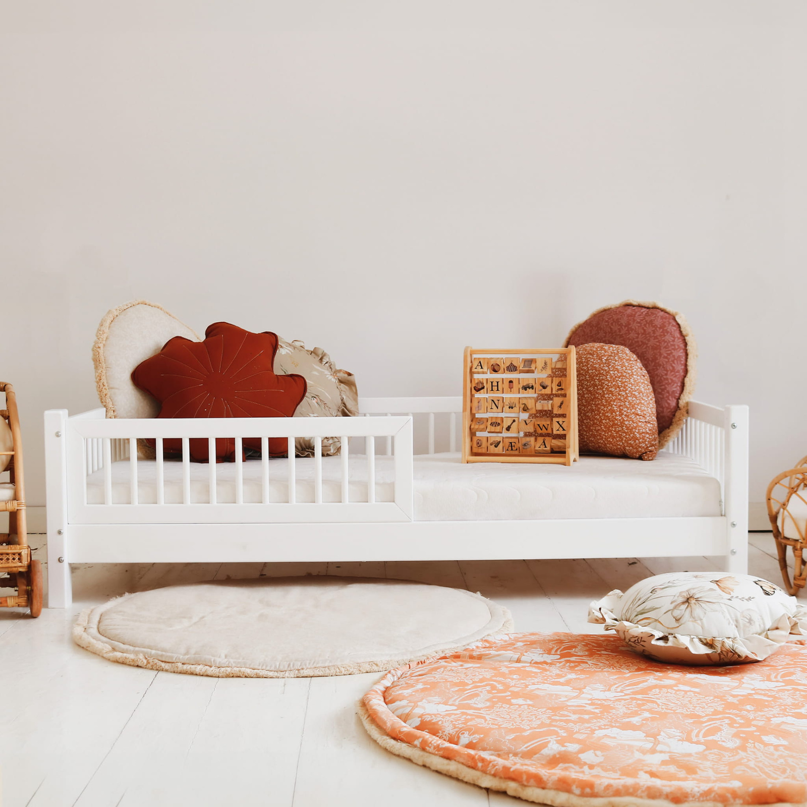 Die abnehmbare Frontschiene kann flexibel auf der linken oder rechten Seite montiert werden. Sie bietet zusätzlichen Schutz für das Kind und lässt sich entfernen, sobald das Kind älter wird. So passt sich das Bett an den Raum und die Bedürfnisse des Kindes an.