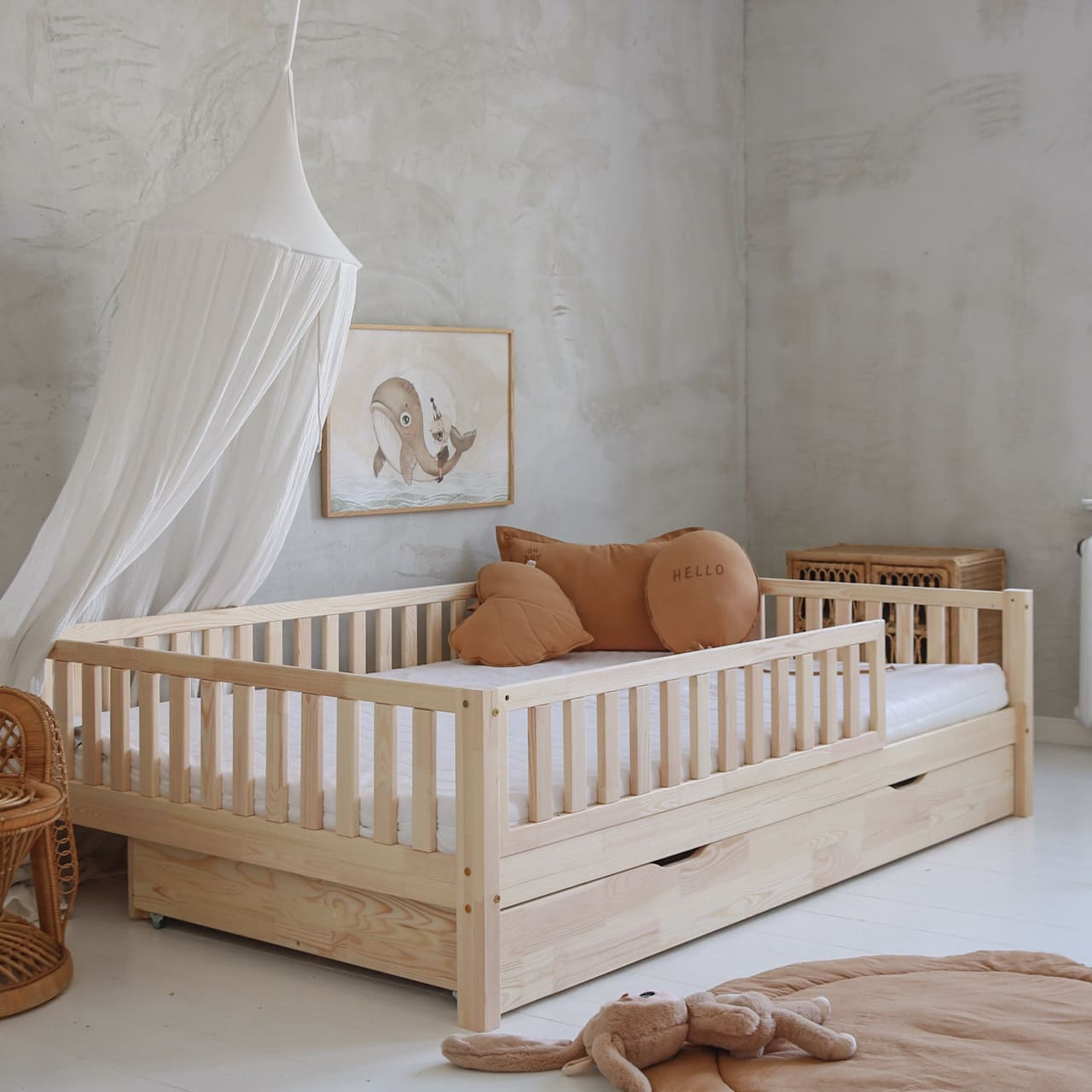 Das Kinderbett ist im minimalistischen skandinavischen Design gefertigt und bietet eine sichere Schlafgelegenheit für Kinder. Es verfügt über ein abnehmbares Frontgeländer.