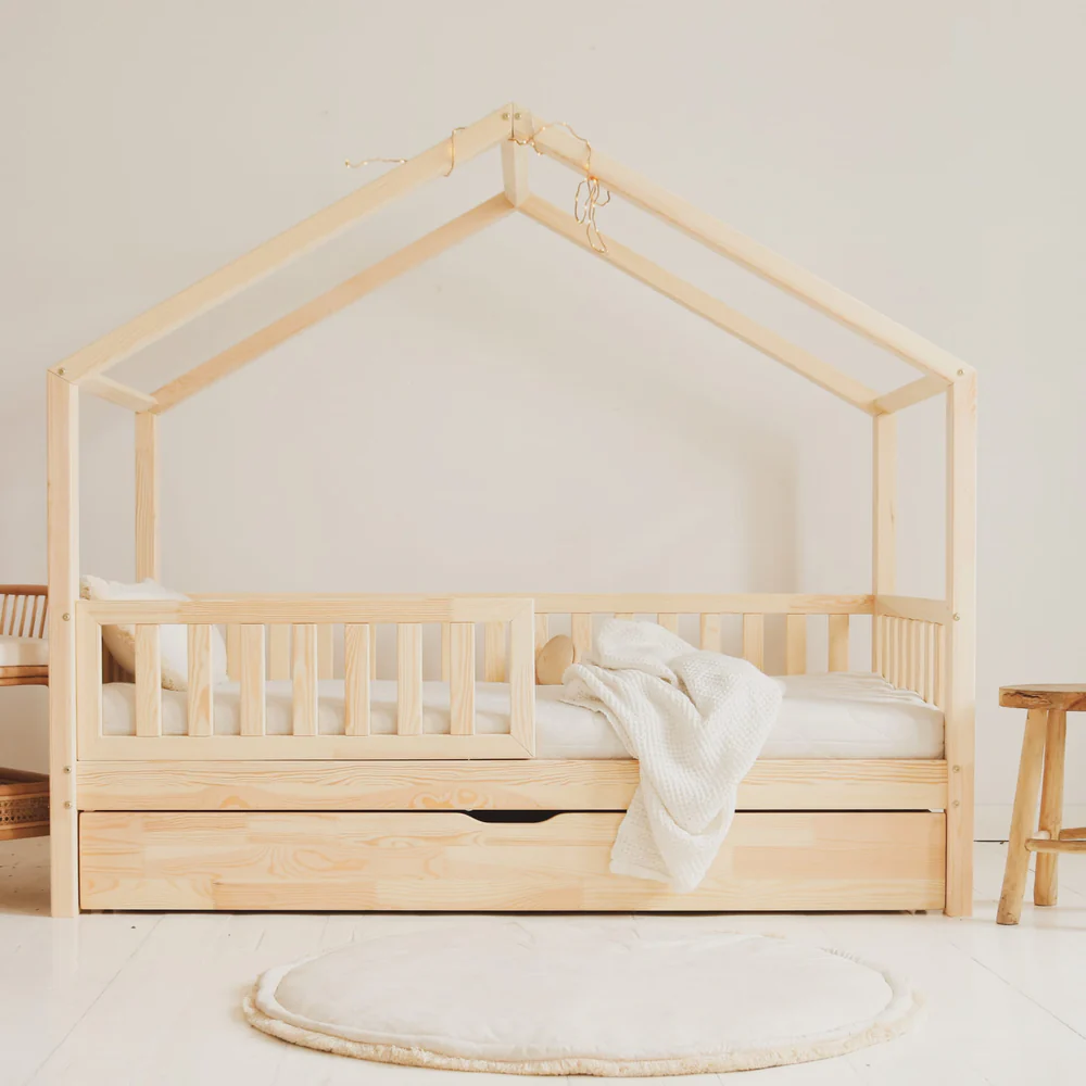 Bestelle jetzt das Design4kids Hausbett Marino Komfort Deluxe 190x90 Naturholz und schaffe Deinem Kind einen sicheren und komfortablen Schlafplatz – mit praktischer Schublade und flexibler Schiene!