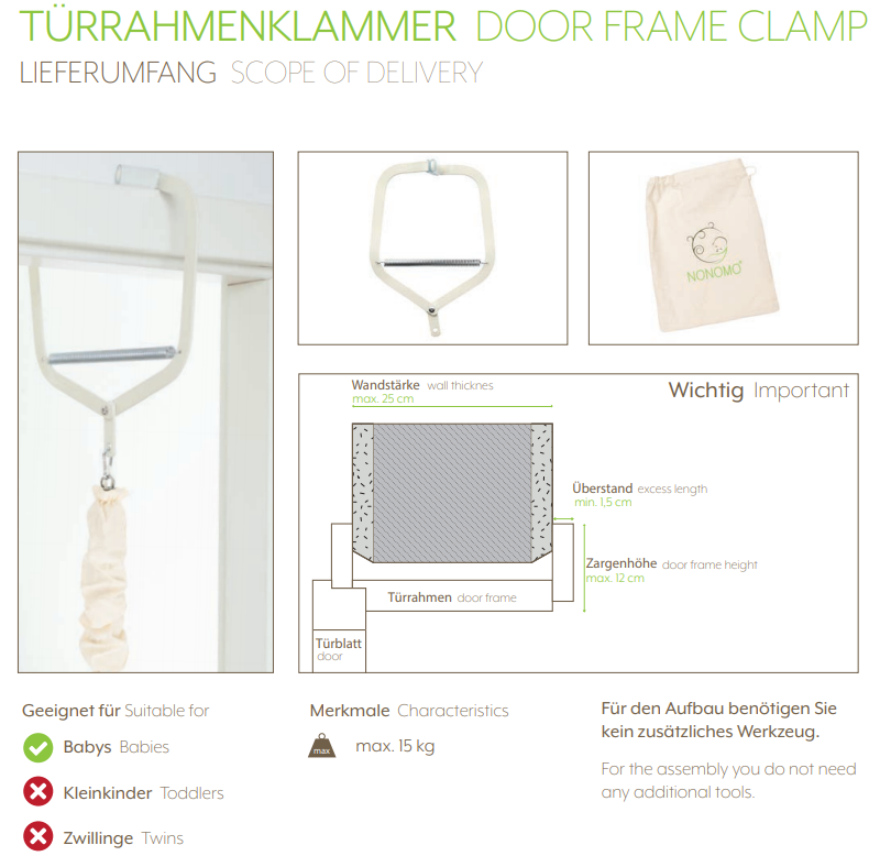 - Die Türklammer für Deine Federwiege kann an jedem Türrahmen befestigt werden, sofern dieser mindestens 0,5 cm Überstand hat und eine maximale Wandstärke von 22 cm nicht überschreitet.