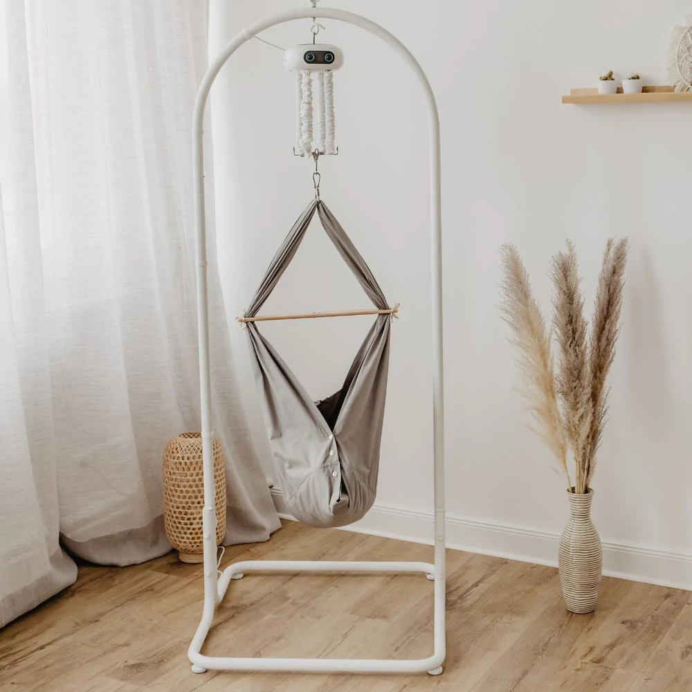 Die beliebteste Aufhängung für die swing2sleep Federwiegen ist das Gestell in der Farbe Weiß, Sparkle Silver oder Taube. Gefertigt aus stabilen pulverbeschichteten Stahlrohren, ideal für den Aufbau in jedem Zimmer Deiner Wahl. So kannst Du Deine Federwiege dort aufstellen, wo Du gerade bist, und kannst Dein Baby ganz entspannt in Deiner Nähe einschlafen lassen.