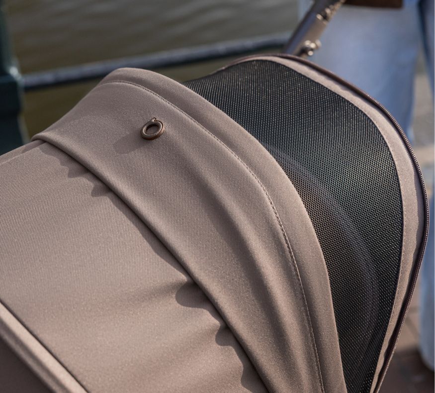 Belüftung 360°. Damit Dein Kind bequem und kühl bleibt, verfügt der IQ über ein ausgeklügeltes Atmungssystem, das an den richtigen Stellen für Belüftung sorgt – vom Verdeck des Kinderbettes über die Fußstütze bis zum Verdeck der Sitzeinheit. Auch die Rückenlehne hat eine Netzbelüftung.