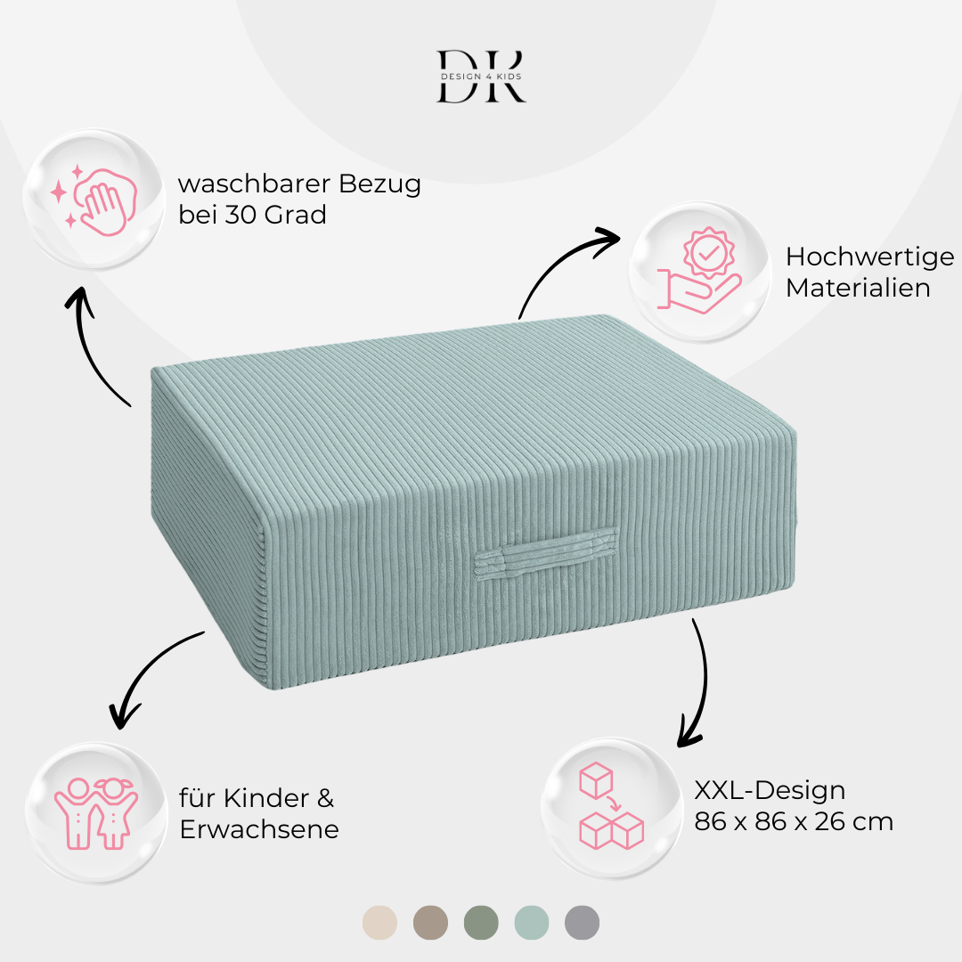 Der weiche, strapazierfähige Cord-Bezug ist angenehm im Griff und hält auch intensivem Spielen stand. Der PUR-Schaumstoffkern sorgt für eine verlässliche Stabilität und langlebige Sprungkraft.