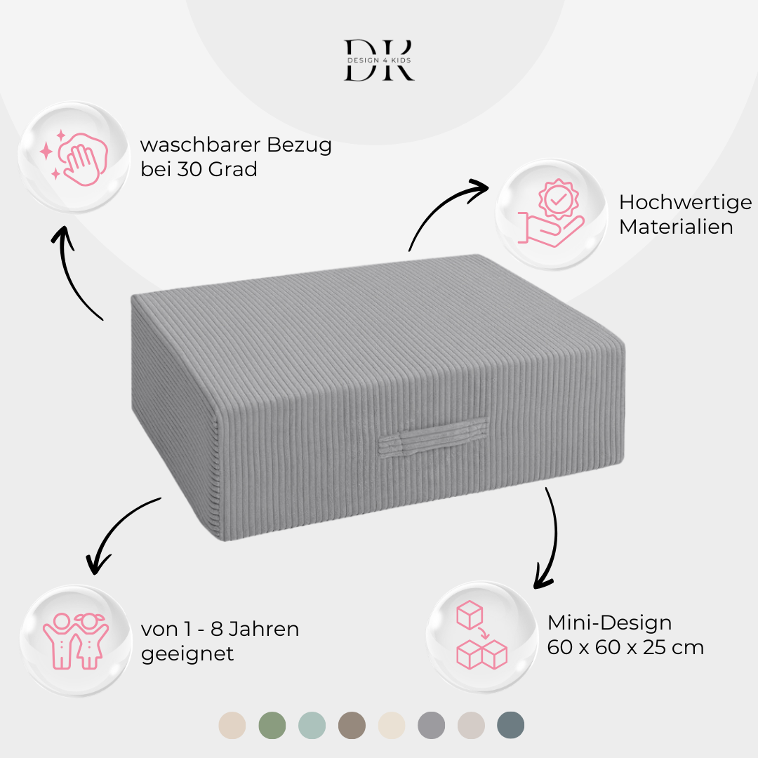 Der strapazierfähige Cord-Bezug ist angenehm weich und hält auch intensivem Spielen stand. Der hochwertige PUR-Schaumstoffkern sorgt für Stabilität und langlebige Sprungkraft.