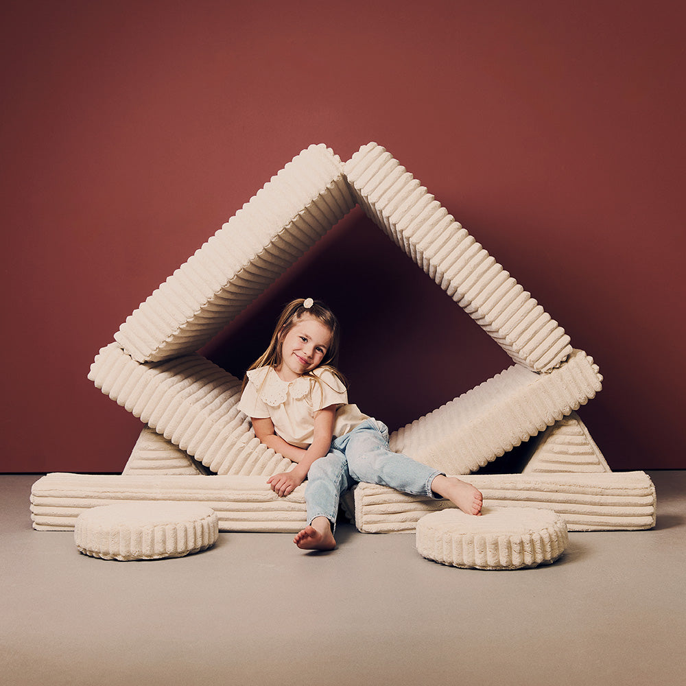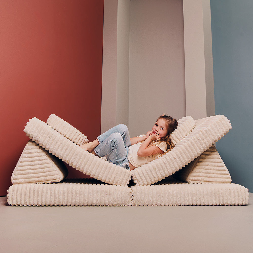 Das Shappy Play Sofa zeichnet sich durch eine clevere Konstruktion aus, bei der die Bodenkissen zusammengenäht sind, so dass zwei Elemente entstehen, die jeweils aus zwei Kissen bestehen. Dies sorgt nicht nur für optimalen Komfort beim Schlafen, sondern bietet auch Stabilität und Halt beim Spielen. Darüber hinaus erzeugt der für die Konstruktion des Sofas verwendete Stoff eine natürliche Reibung, die dazu beiträgt, die Elemente zusammenzuhalten und ein sicheres und nahtloses Spielerlebnis zu gewährleisten.