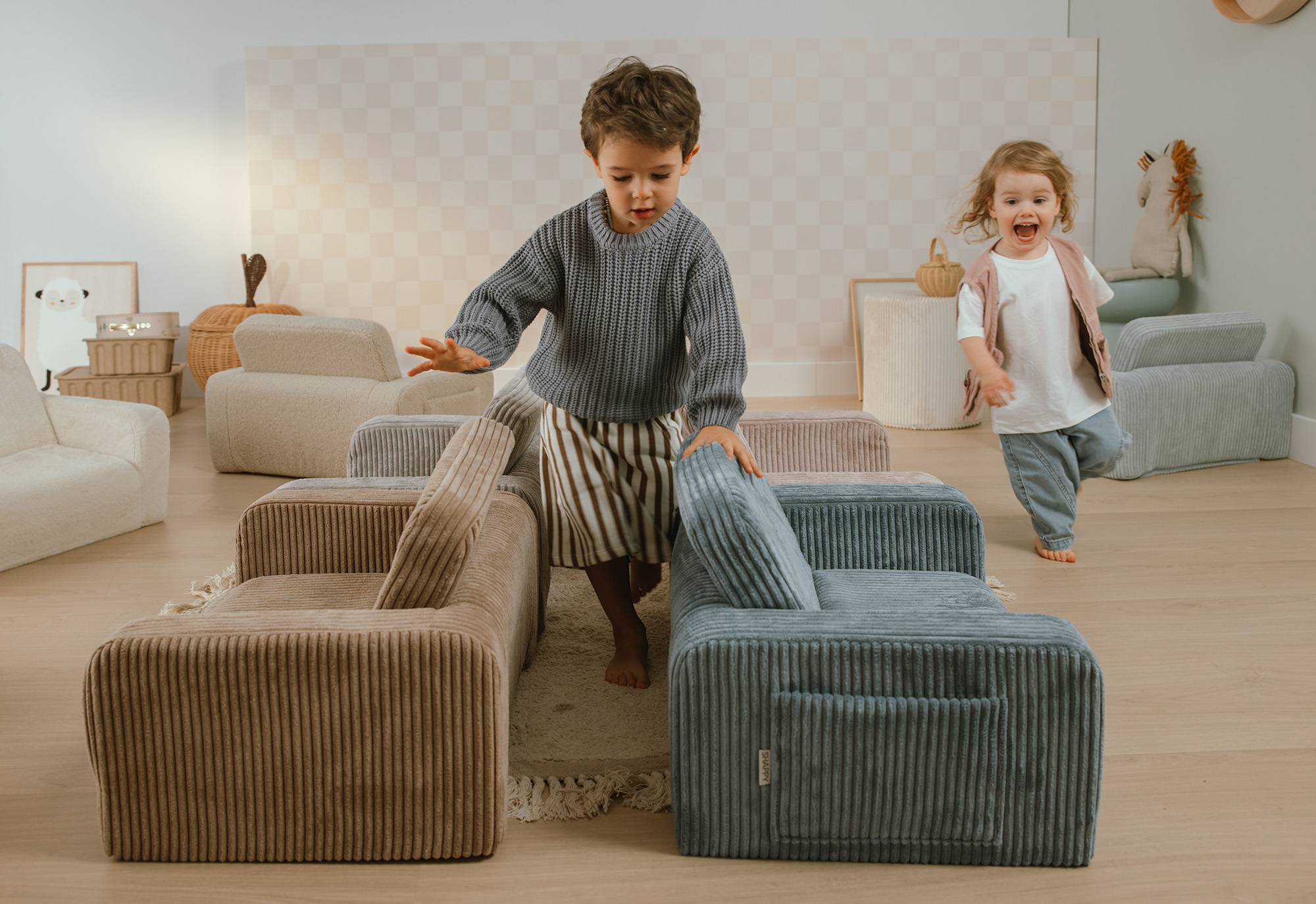 Das Shappy Play Sofa zeichnet sich durch eine clevere Konstruktion aus, bei der die Bodenkissen zusammengenäht sind, so dass zwei Elemente entstehen, die jeweils aus zwei Kissen bestehen. Dies sorgt nicht nur für optimalen Komfort beim Schlafen, sondern bietet auch Stabilität und Halt beim Spielen. Darüber hinaus erzeugt der für die Konstruktion des Sofas verwendete Stoff eine natürliche Reibung, die dazu beiträgt, die Elemente zusammenzuhalten und ein sicheres und nahtloses Spielerlebnis zu gewährleisten.