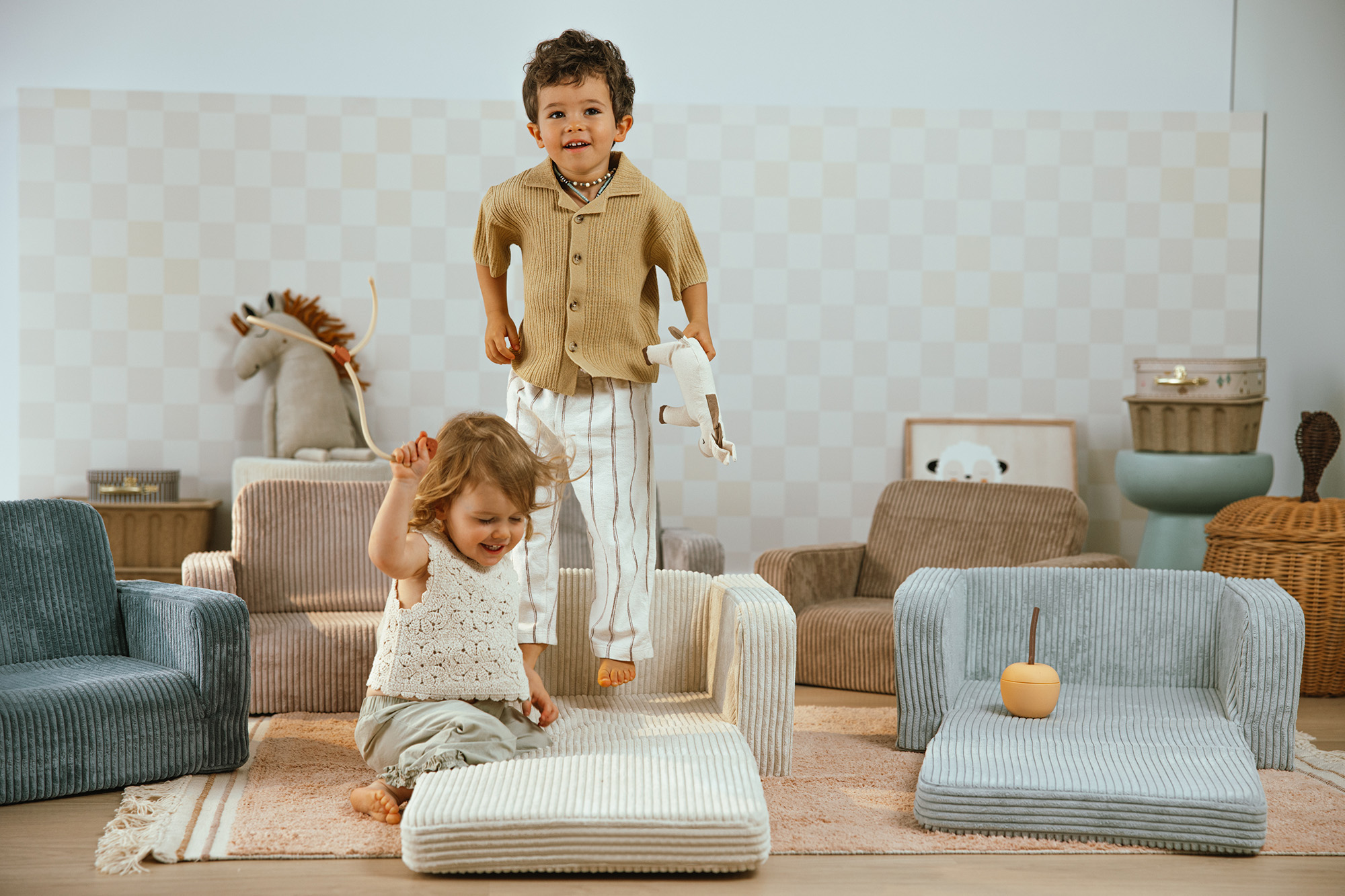 Das Shappy Play Sofa zeichnet sich durch eine clevere Konstruktion aus, bei der die Bodenkissen zusammengenäht sind, so dass zwei Elemente entstehen, die jeweils aus zwei Kissen bestehen. Dies sorgt nicht nur für optimalen Komfort beim Schlafen, sondern bietet auch Stabilität und Halt beim Spielen. Darüber hinaus erzeugt der für die Konstruktion des Sofas verwendete Stoff eine natürliche Reibung, die dazu beiträgt, die Elemente zusammenzuhalten und ein sicheres und nahtloses Spielerlebnis zu gewährleisten.