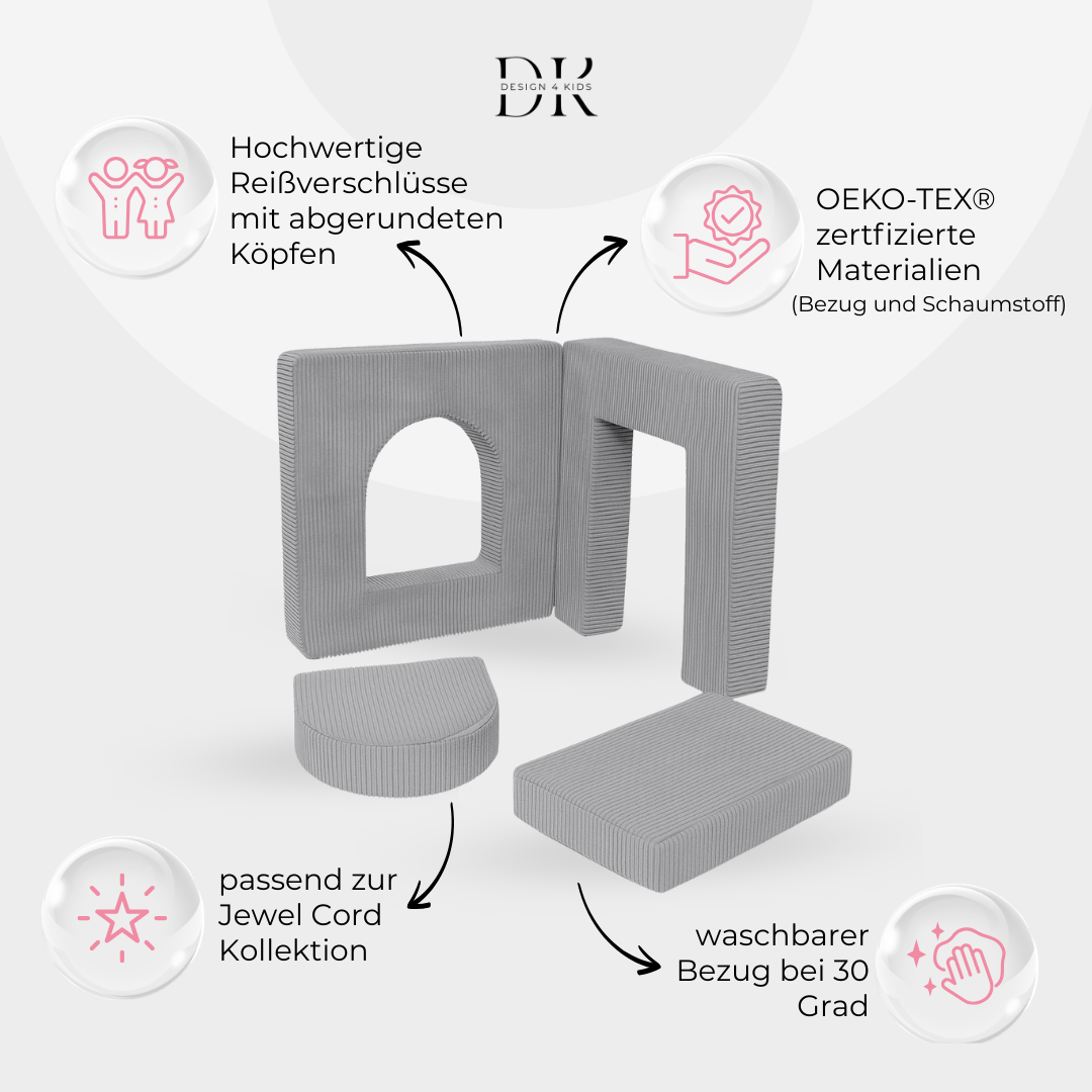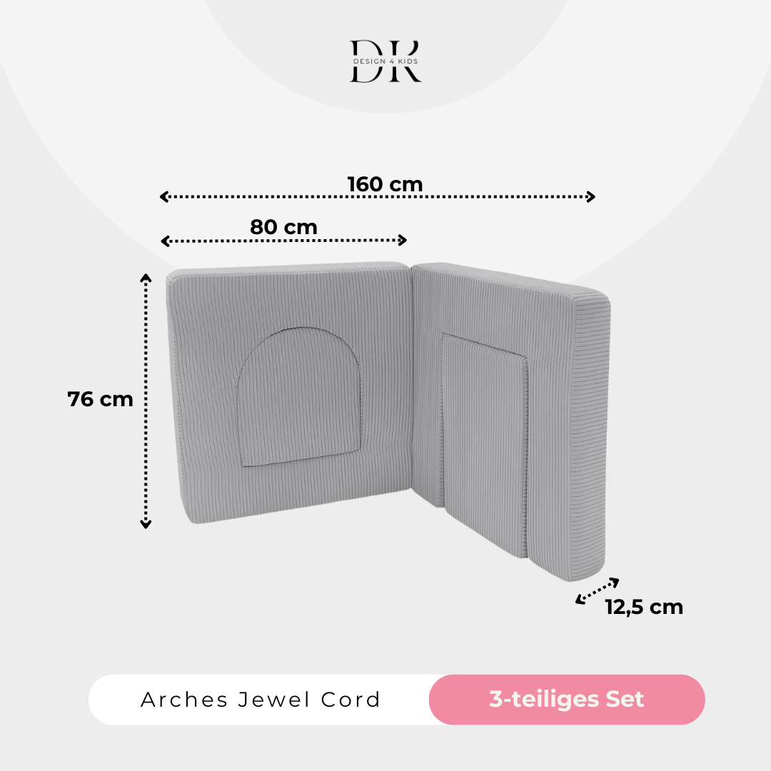 Mehr Spielspaß, mehr Möglichkeiten, mehr Kreativität: Das Design4Kids Arches-Set erweitert die Spielsofas aus unserer Jewel-Kollektion um zwei Torbögen und zwei Türen – perfekt für unzählige fantasievolle Spielsituationen.