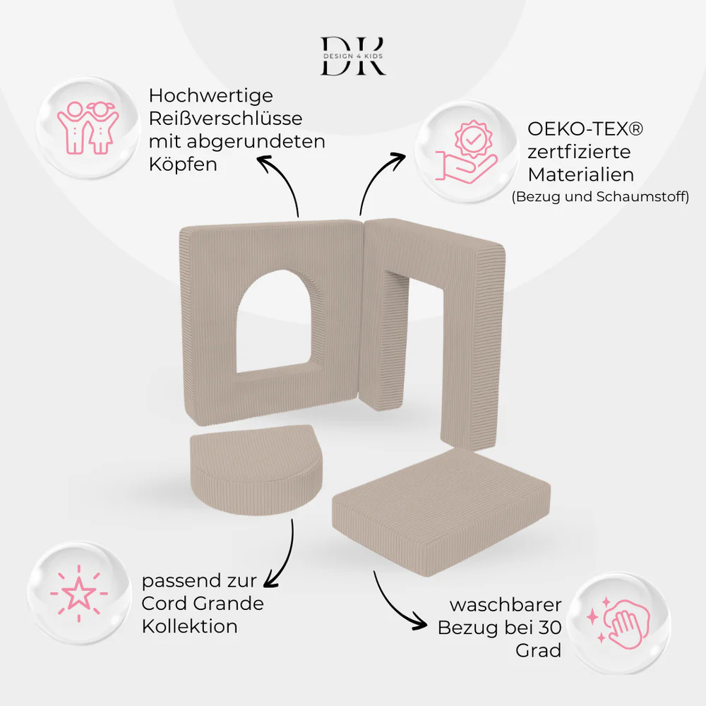 Ob als Torbogen für kleine Burgen mit abnehmbaren Türen, als Arm- und Rückenlehnen-Duo, als Mini-Spielbereich/Bällebad-Erweiterung oder als fantasievolle Schutzschilde – die Elemente lassen sich jederzeit neu kombinieren und an die Abenteuer Deiner Kinder anpassen. Deiner Kreativität sind keine Grenzen gesetzt!