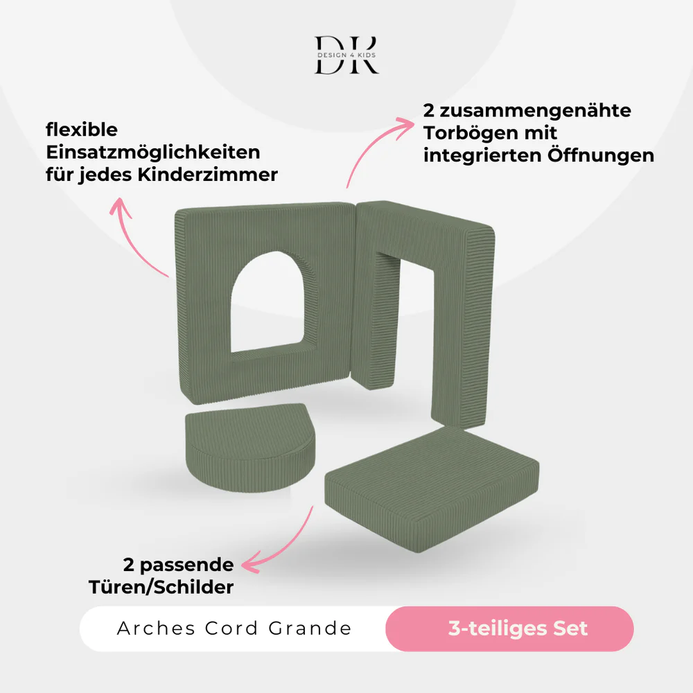 Bringe noch mehr Spielspaß und Kreativität in das Kinderzimmer – mit unserem Design4Kids Arches-Set aus zwei Torbögen und zwei Türen! Diese vielseitige Erweiterung macht dein Spielsofa noch flexibler und eröffnet unzählige neue Spielideen.