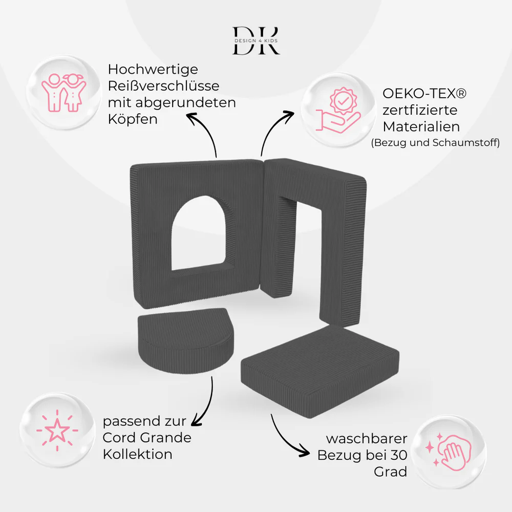 Ob als Torbogen für kleine Burgen mit abnehmbaren Türen, als Arm- und Rückenlehnen-Duo, als Mini-Spielbereich/Bällebad-Erweiterung oder als fantasievolle Schutzschilde – die Elemente lassen sich jederzeit neu kombinieren und an die Abenteuer Deiner Kinder anpassen. Deiner Kreativität sind keine Grenzen gesetzt!