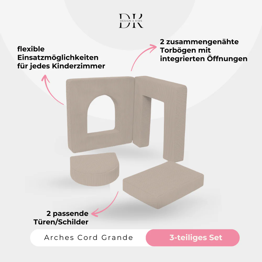Bringe noch mehr Spielspaß und Kreativität in das Kinderzimmer – mit unserem Design4Kids Arches-Set aus zwei Torbögen und zwei Türen! Diese vielseitige Erweiterung macht dein Spielsofa noch flexibler und eröffnet unzählige neue Spielideen.