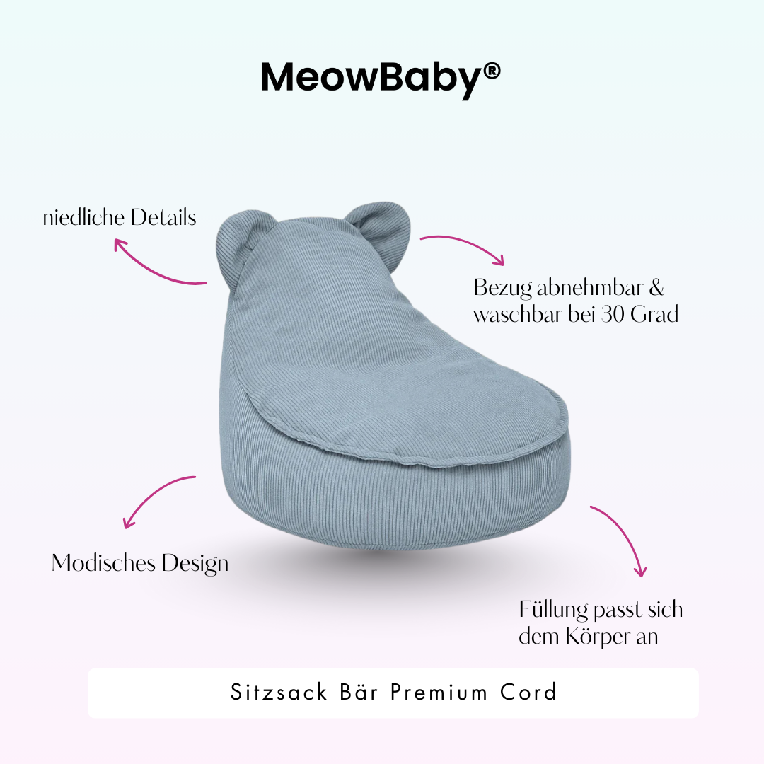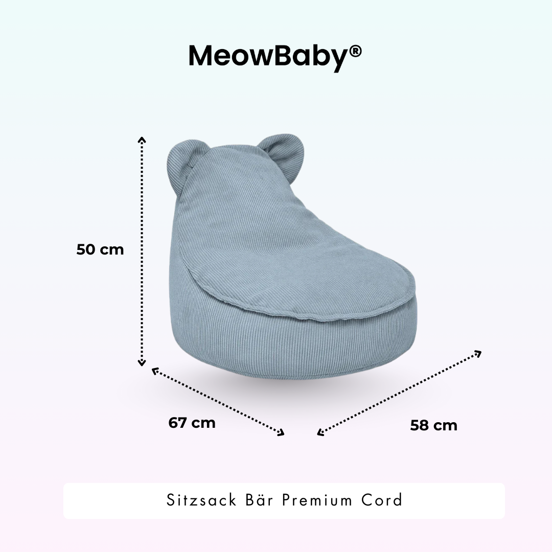 Wir bemühen uns um genaue Farbwiedergabe auf dem Bildschirm, können jedoch keine perfekte Reproduktion garantieren. Besonders bei Samtprodukten kann die Farbe je nach Licht und Richtung variieren, was dem Produkt eine lebendige Optik verleiht.MeowBaby Sitzsack Bär Cord Premium - türkis